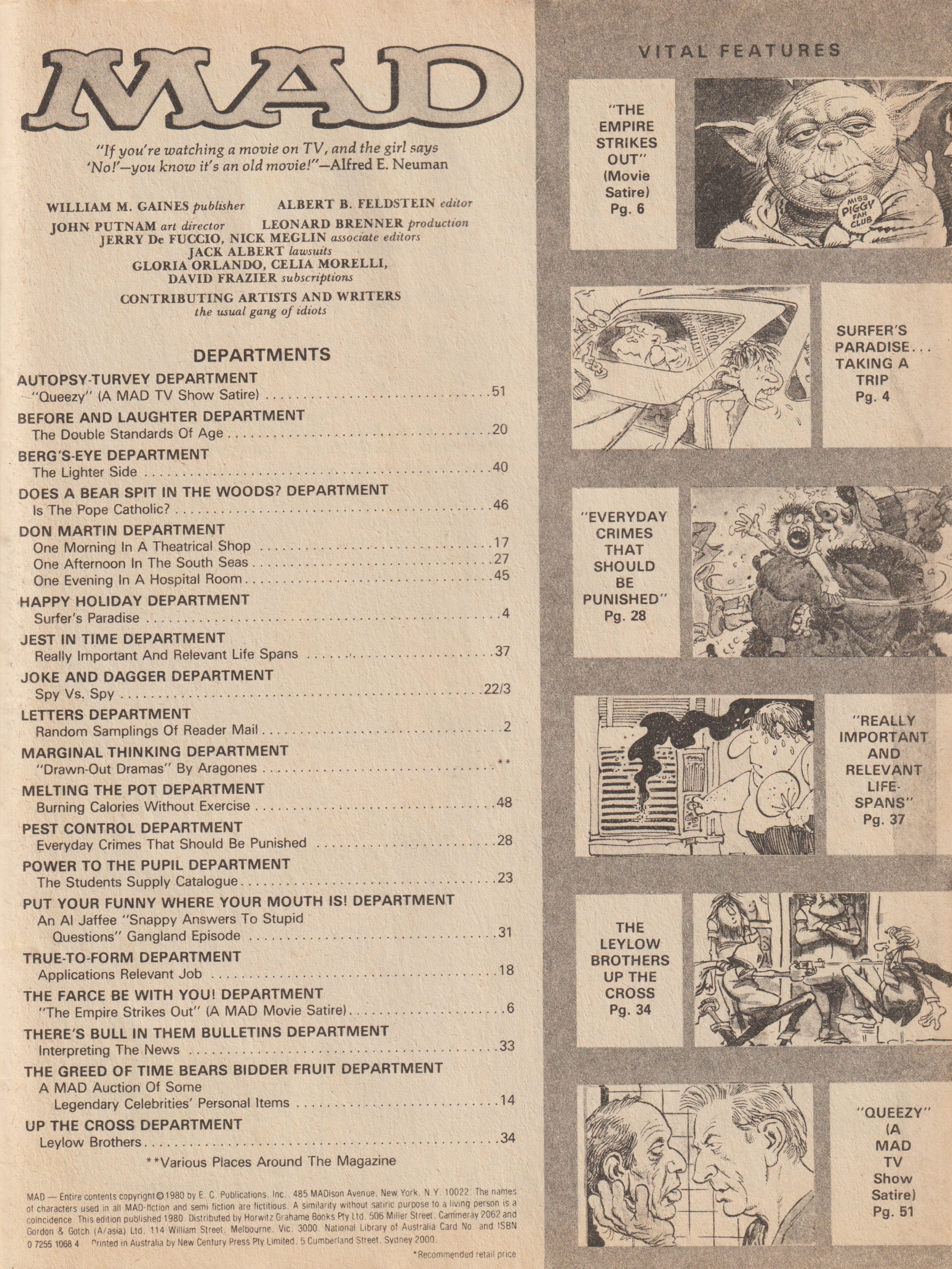 MAD Magazine #220 MAD Magazine (Australia) Updated: August 2nd, 2021 Country: AustraliaCover: Yoda from Star WarsOriginal cover: MAD Magazine #220 • USA • 1st Edition - New YorkSale price: AU$1.25Format: Magazine Editorial Cover Artist: Jack Rickard Additional Images Cover Variations USAArgentinaFinlandGreat BritainGermanyGreecePuerto RicoThailand