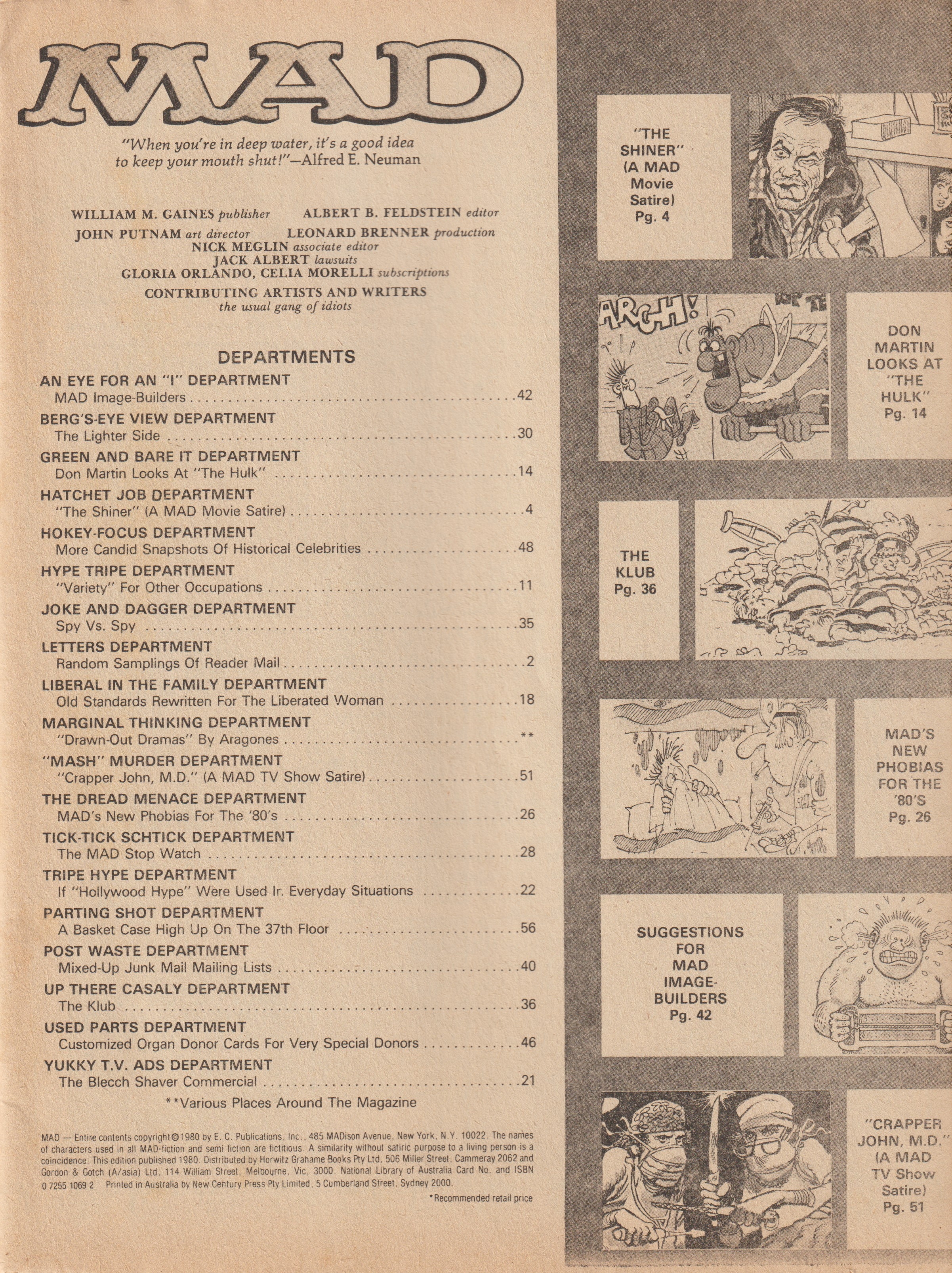 MAD Magazine #221 MAD Magazine (Australia) Updated: August 2nd, 2021 Country: AustraliaCompany: Horwitz GrahamePublished: 1980Cover: MAD Magazine Down Under shortage coming! Hoard this Issue!Original cover: MAD Magazine #221 • USA • 1st Edition - New YorkSale price: AU$1.25Pages: 60Format: Magazine - Cover from US MAD No.221 Editorial Cover Artist: Norman Mingo Additional Images Cover Variations USAGreat BritainGreece