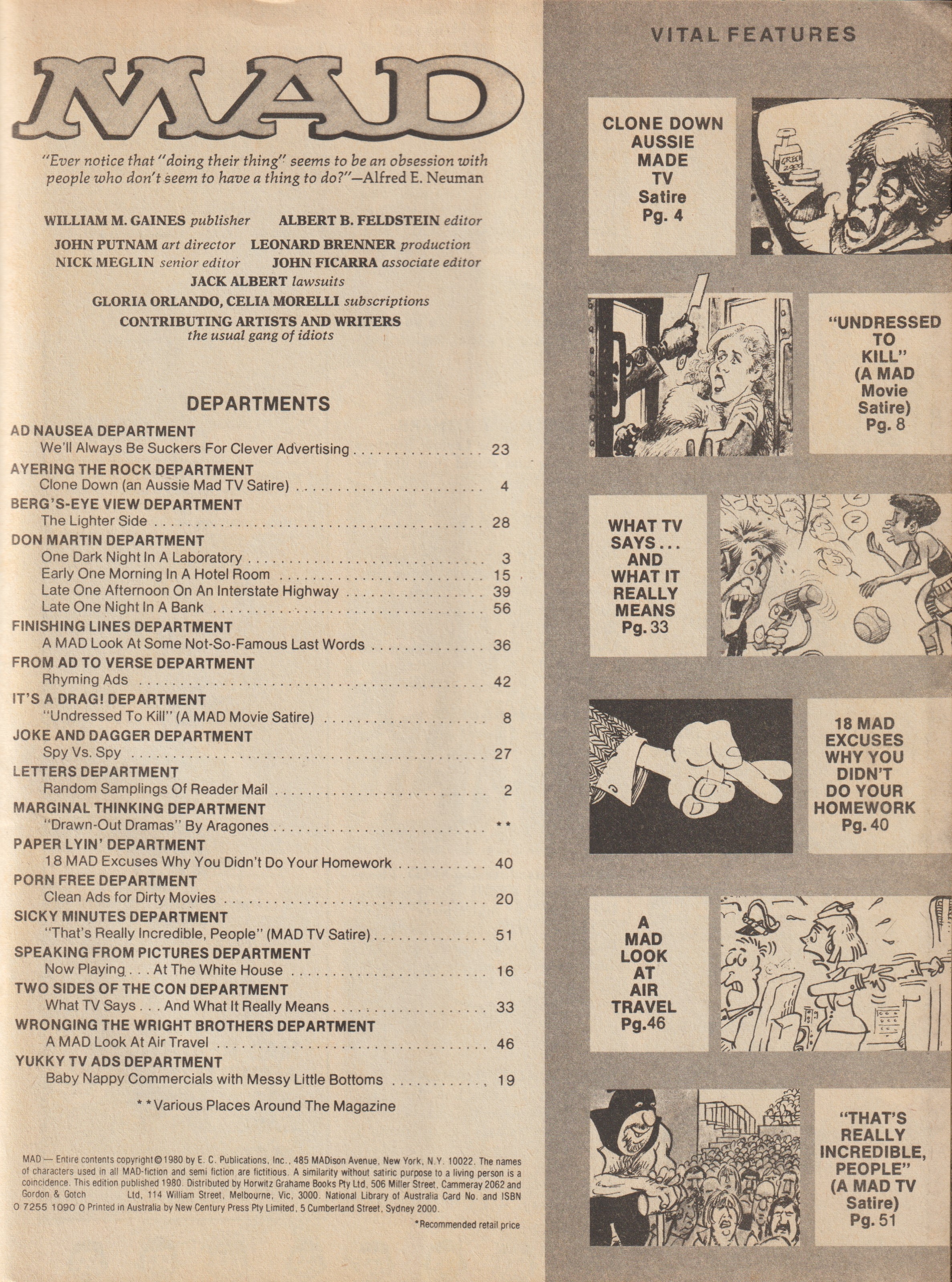 MAD Magazine #222 MAD Magazine (Australia) Updated: August 2nd, 2021 Country: AustraliaCompany: Horwitz PublicationsCover: MAD salutes the Coffee BreakOriginal cover: MAD Magazine #222 • USA • 1st Edition - New YorkSale price: AUD $1.25Pages: 58Format: Magazine Editorial Editor: Al FeldsteinCover Artist: Norman Mingo Additional Images Cover Variations USABrasilFinlandGreat BritainPuerto RicoSweden