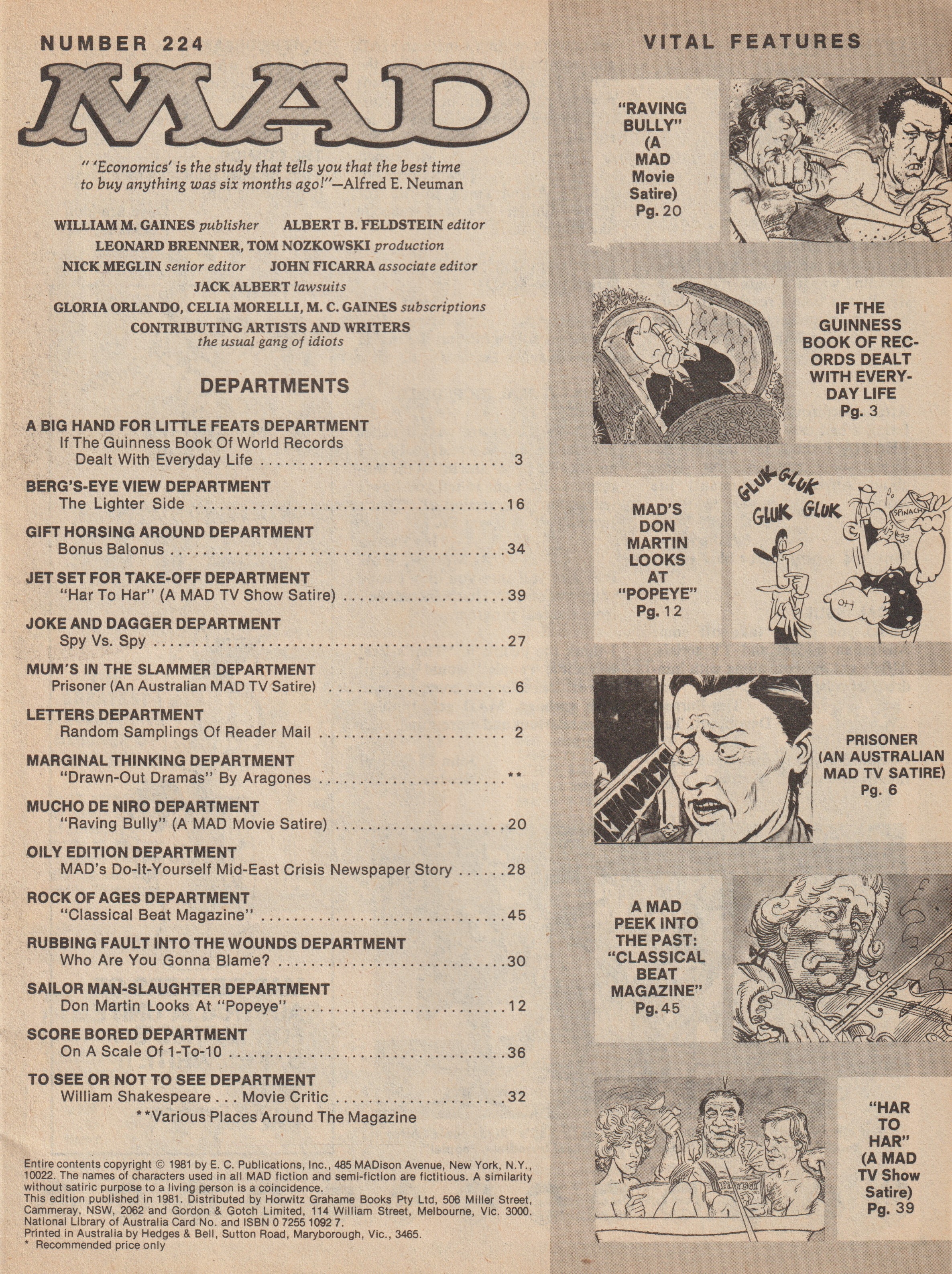 MAD Magazine #224 MAD Magazine (Australia) Updated: August 2nd, 2021 Country: AustraliaCompany: Horwitz GrahameCover: Don Martin Looks at PopeyeSale price: AU$1.25Format: Magazine Editorial Cover Artist: Dave Emerson Additional Images