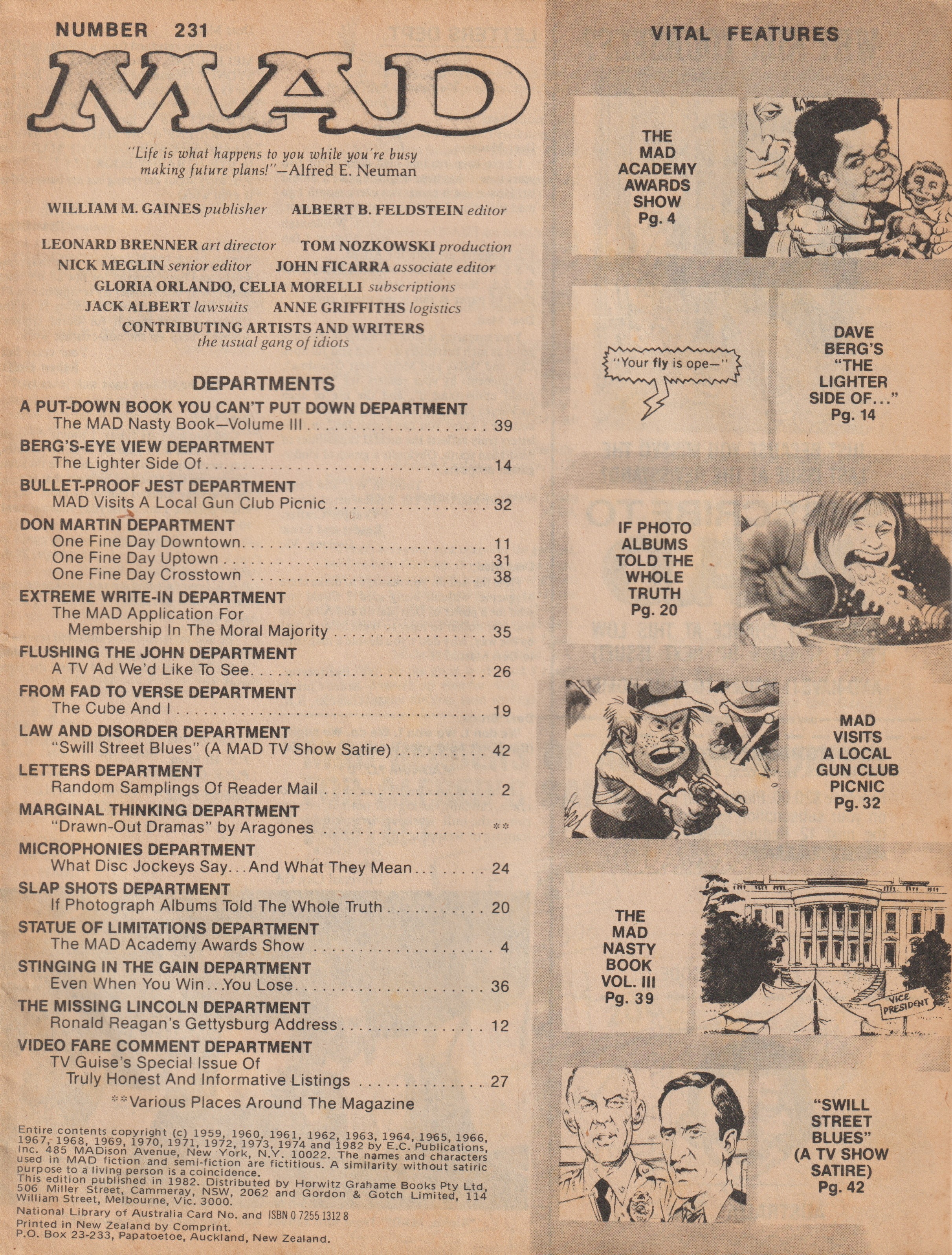 MAD Magazine #231 MAD Magazine (Australia) Updated: 0000 © CollectMAD.com Country: AustraliaOriginal cover: MAD Magazine #231 • USA • 1st Edition - New York Additional Images Cover Variations USAArgentinaBrasilGreat BritainGreeceMexico