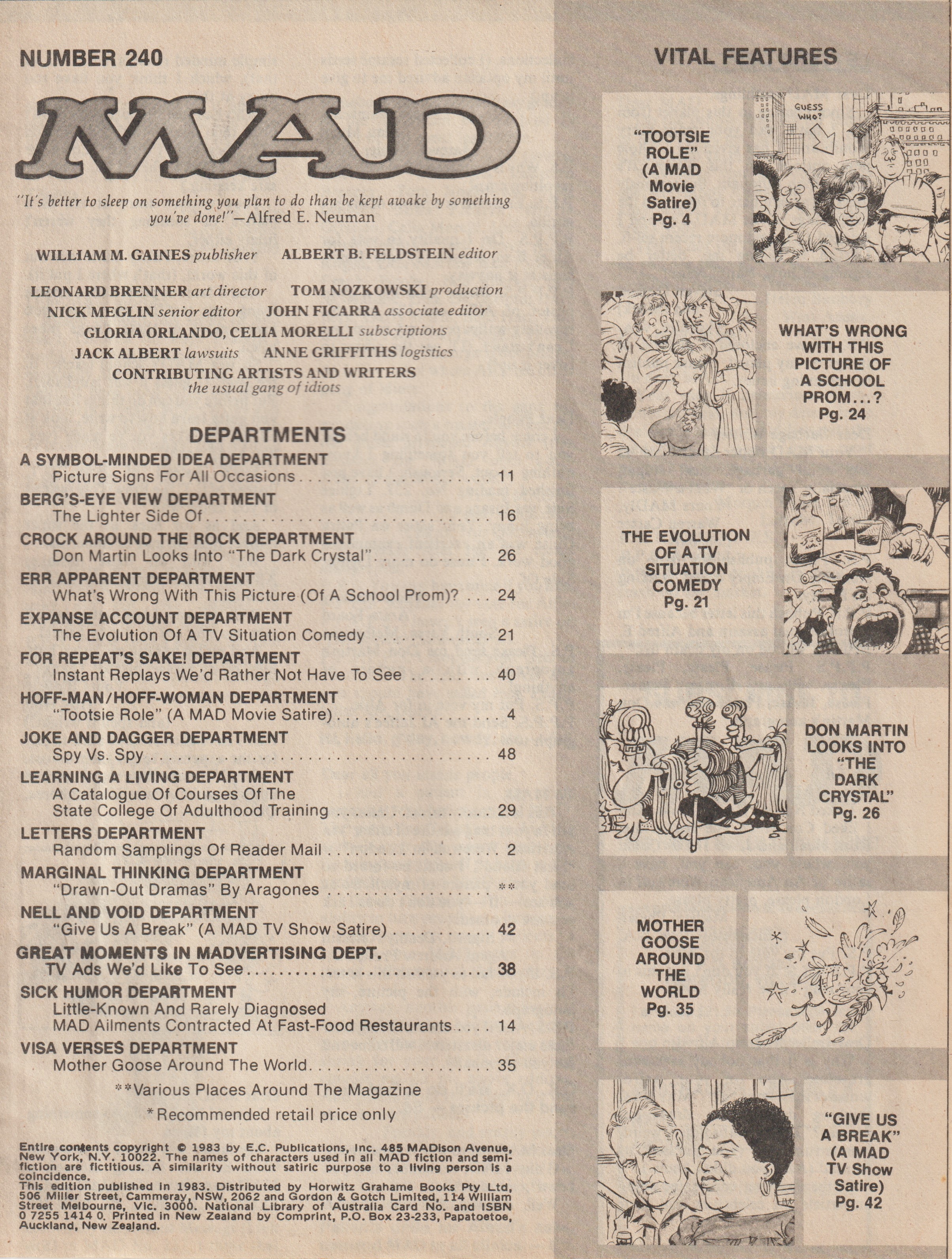 MAD Magazine #240 MAD Magazine (Australia) Updated: 0000 © CollectMAD.com Country: AustraliaOriginal cover: MAD Magazine #240 • USA • 1st Edition - New York Additional Images Cover Variations USAGreat BritainGreeceMexico