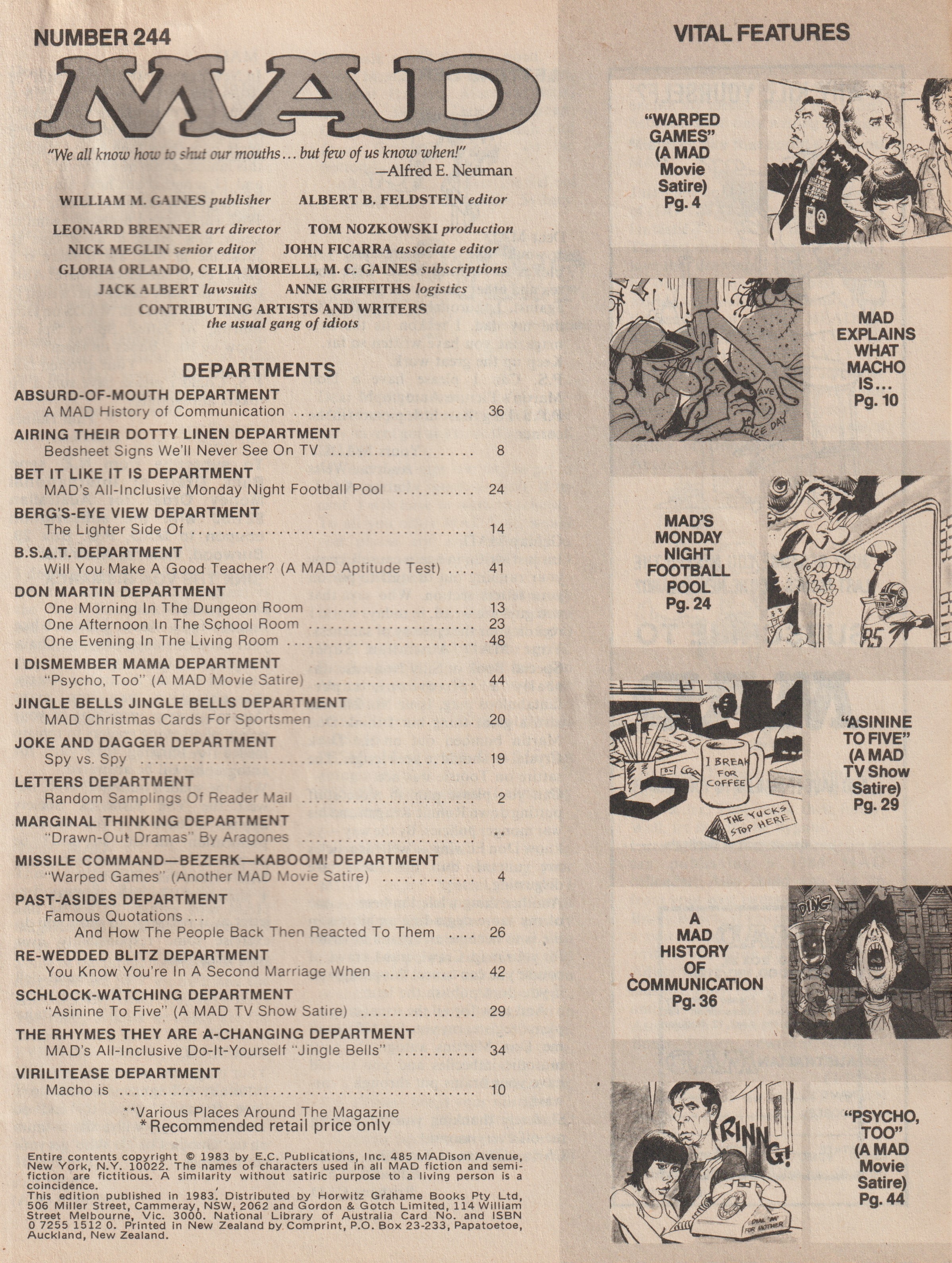 MAD Magazine #244 MAD Magazine (Australia) Updated: 0000 © CollectMAD.com Country: AustraliaOriginal cover: MAD Magazine #244 • USA • 1st Edition - New York Additional Images Cover Variations USAGreat BritainGreece