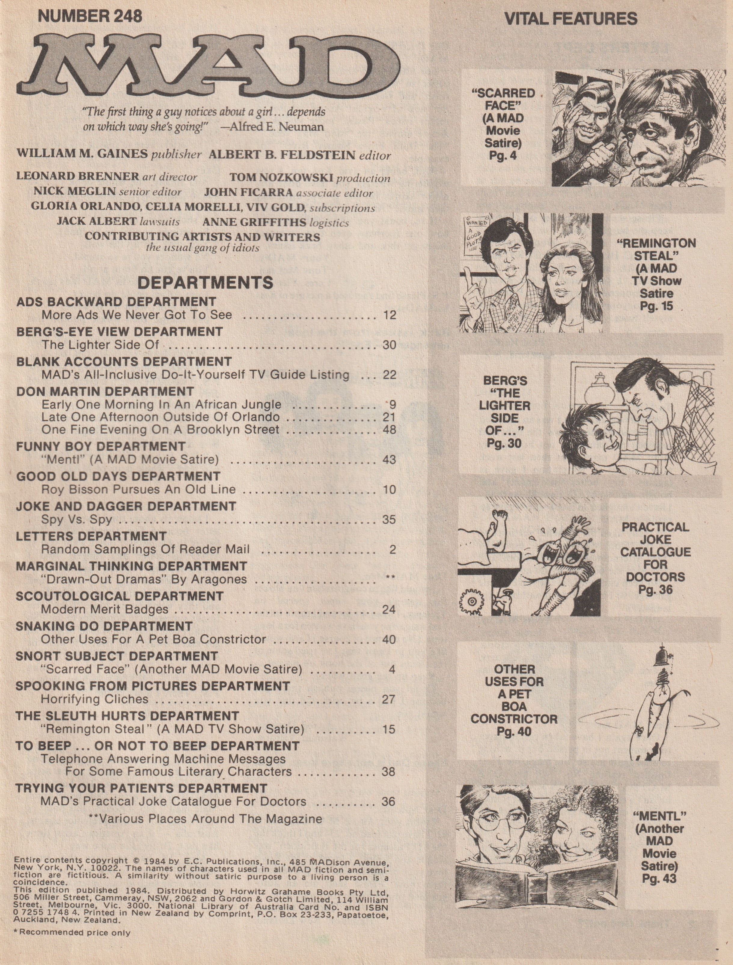MAD Magazine #248 MAD Magazine (Australia) Updated: 0000 © CollectMAD.com Country: AustraliaOriginal cover: MAD Magazine #248 • USA • 1st Edition - New York Additional Images Cover Variations USAFinlandGreat BritainGermanyHungaryNorwaySweden