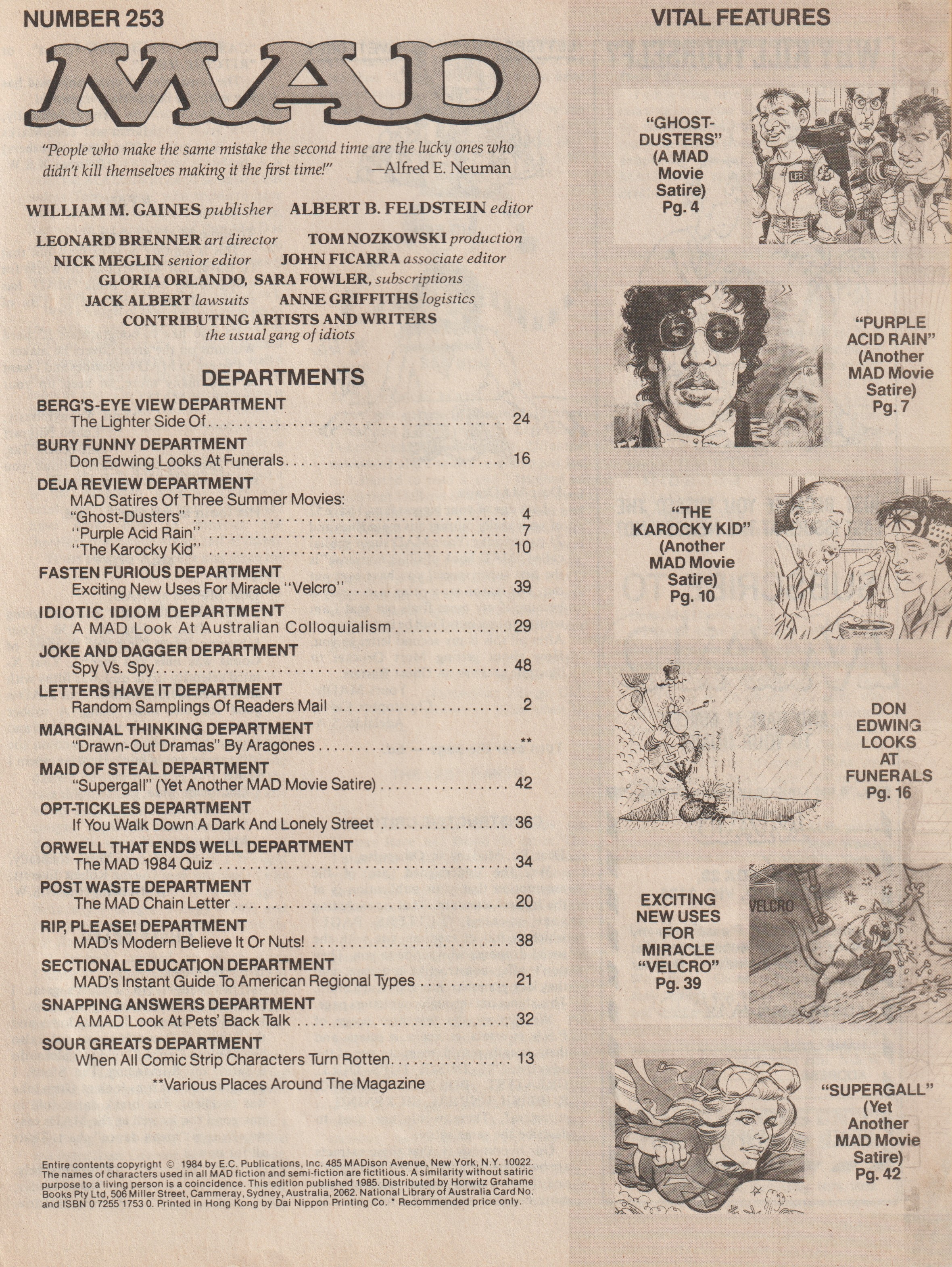 MAD Magazine #253 MAD Magazine (Australia) Updated: July 28th, 2021 Country: AustraliaCover: Ghost DustersSale price: AU$1.50Format: Magazine Editorial Cover Artist: Roy Bisson Additional Images