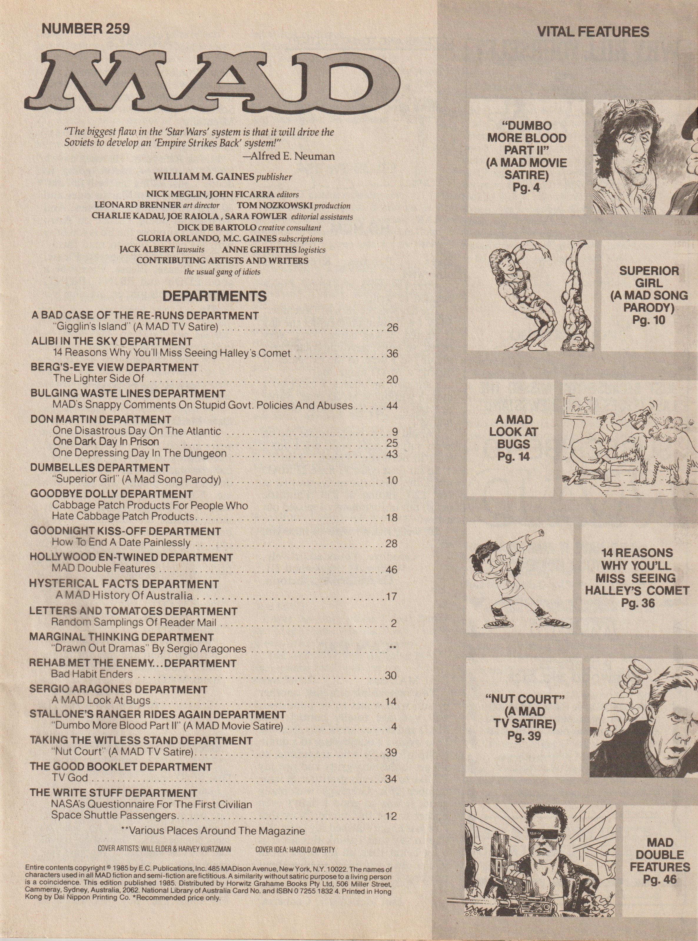 MAD Magazine #259 MAD Magazine (Australia) Updated: 0000 © CollectMAD.com Country: AustraliaOriginal cover: MAD Magazine #259 • USA • 1st Edition - New York Additional Images Cover Variations USABrasilFinlandGreat BritainSouth AfricaGreeceGreece