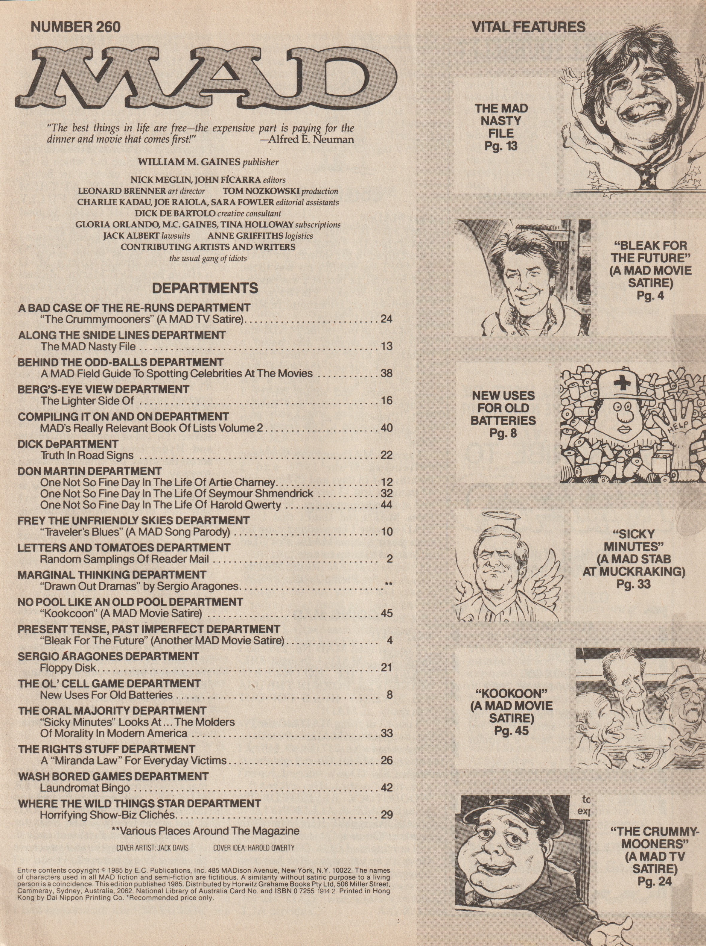 MAD Magazine #260 MAD Magazine (Australia) Updated: 0000 Please help!We are desperately looking for pictures of MAD Magazine #260 • Australia. Drop us a mail here! Country: AustraliaOriginal cover: MAD Magazine #260 • USA • 1st Edition - New York Additional Images © CollectMAD.com Cover Variations USABrasilFinlandGreat BritainSouth Africa