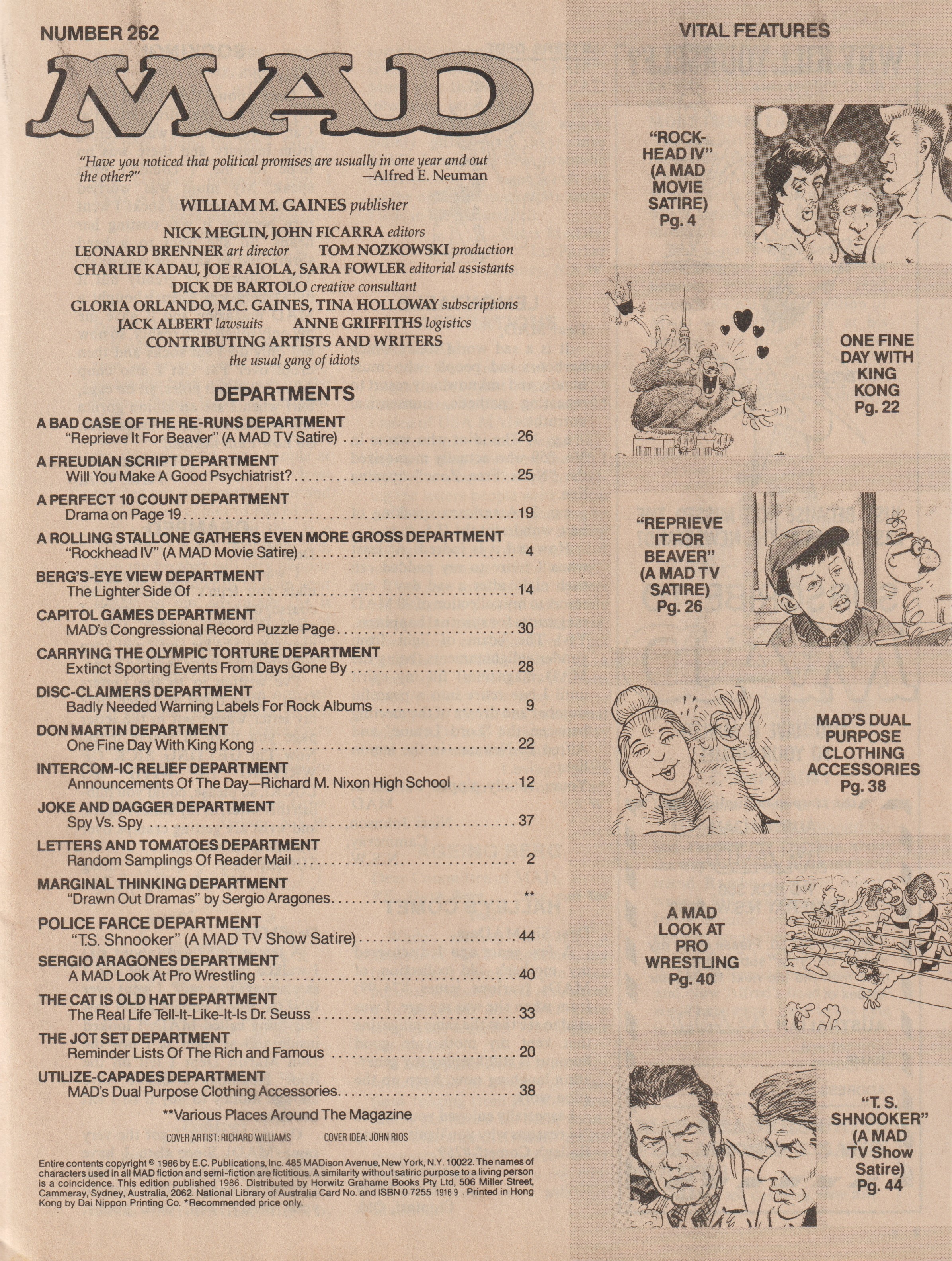 MAD Magazine #262 MAD Magazine (Australia) Updated: 0000 © CollectMAD.com Country: AustraliaOriginal cover: MAD Magazine #262 • USA • 1st Edition - New York Additional Images Cover Variations USAFinlandGreat BritainSouth Africa