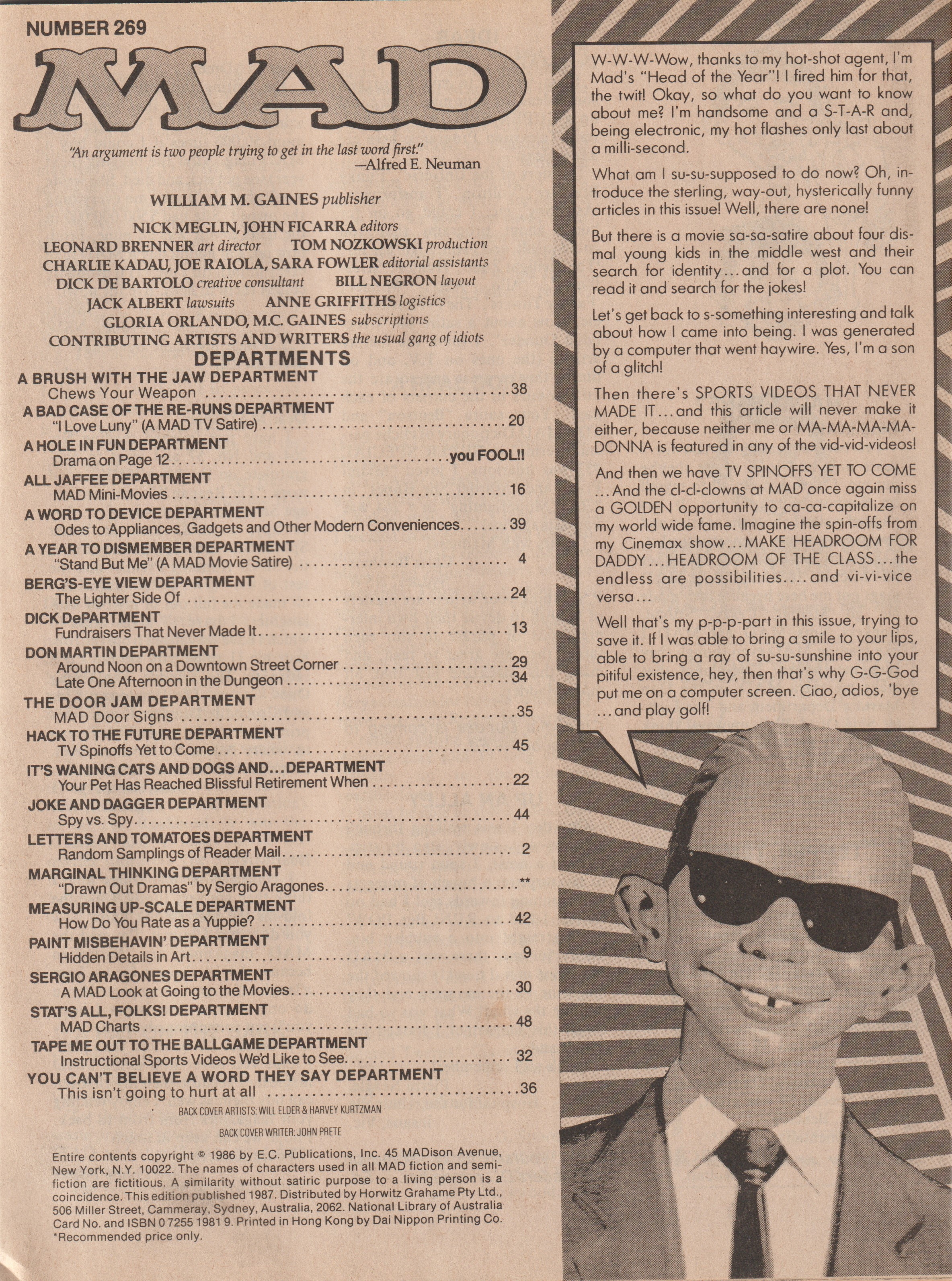 MAD Magazine #269 MAD Magazine (Australia) Updated: 0000 © CollectMAD.com Country: AustraliaOriginal cover: MAD Magazine #269 • USA • 1st Edition - New York Additional Images Cover Variations USAGreat BritainSouth Africa
