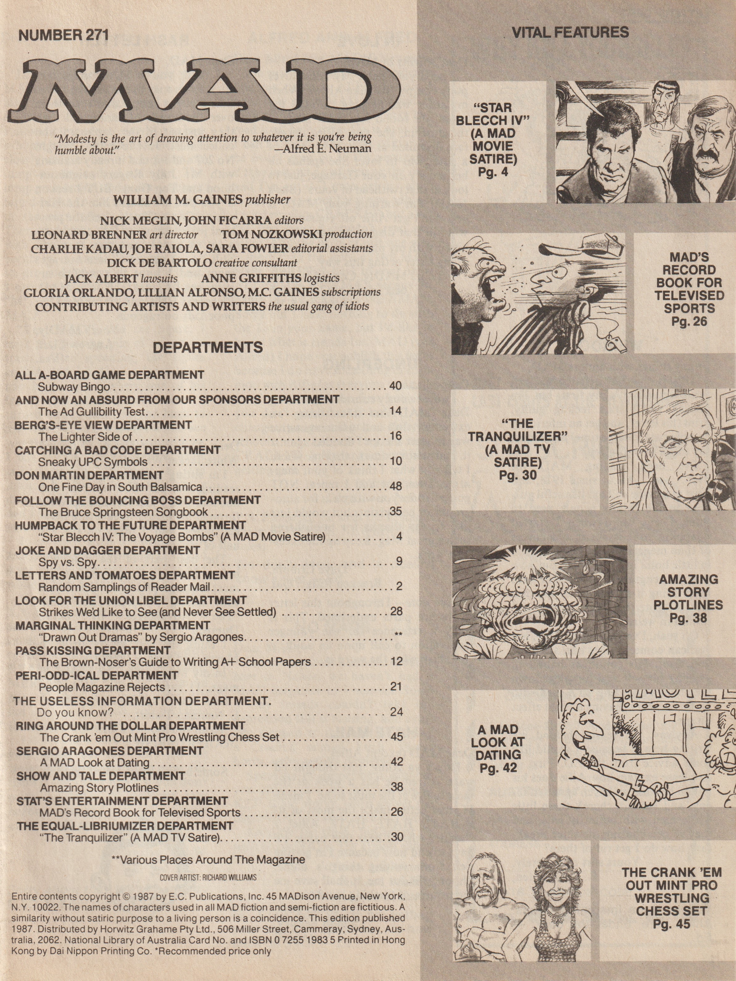MAD Magazine #271 MAD Magazine (Australia) Updated: 0000 © CollectMAD.com Country: AustraliaPublished: 1987Original cover: MAD Magazine #271 • USA • 1st Edition - New York Editorial Cover Artist: Richard Williams Additional Images Cover Variations USAGreat BritainSouth AfricaSweden