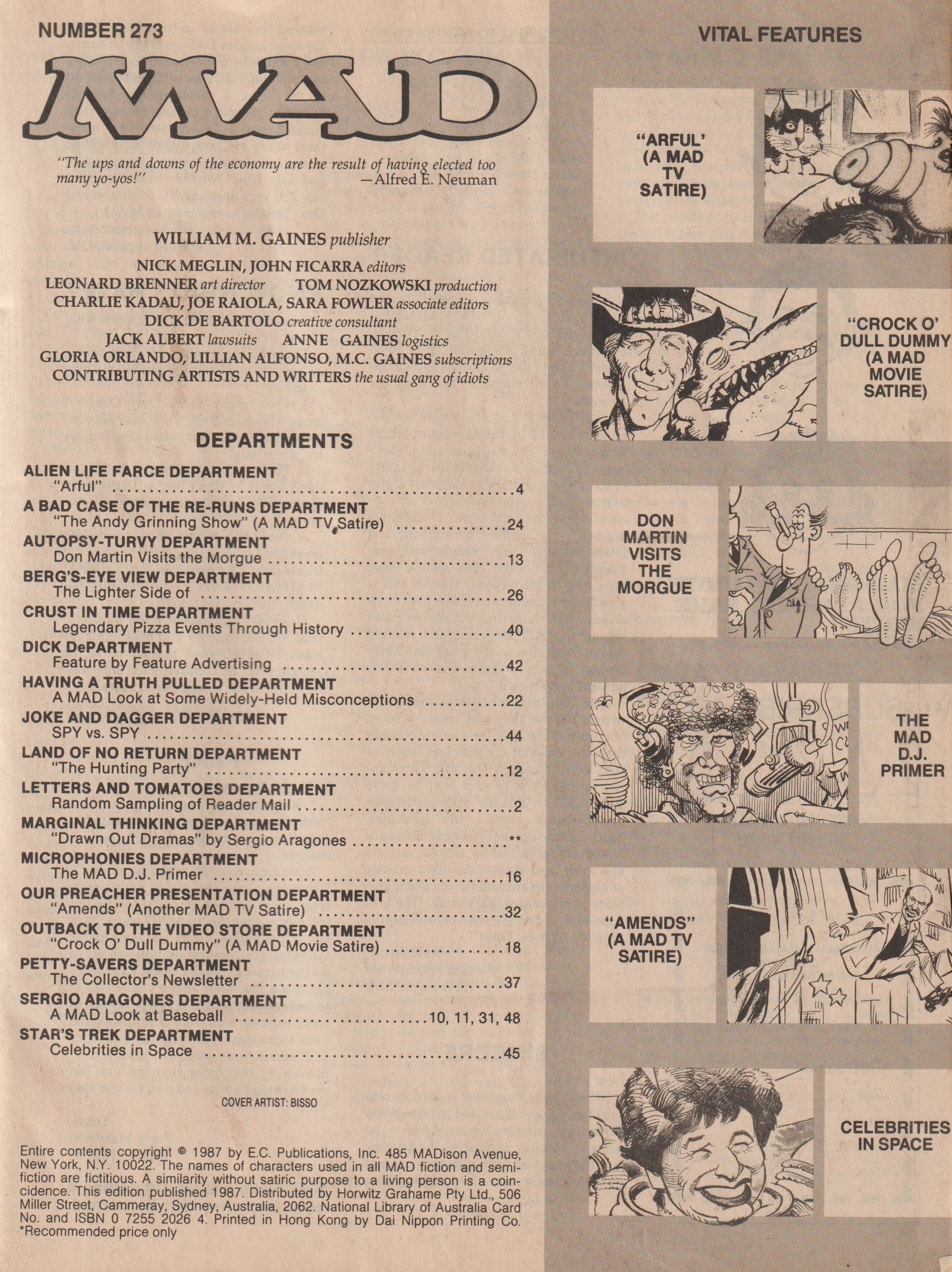MAD Magazine #273 MAD Magazine (Australia) Updated: July 28th, 2021 Country: AustraliaCover: Alf - No ProblemSale price: AU$1.60Format: Magazine Editorial Cover Artist: Roy Bisson Additional Images