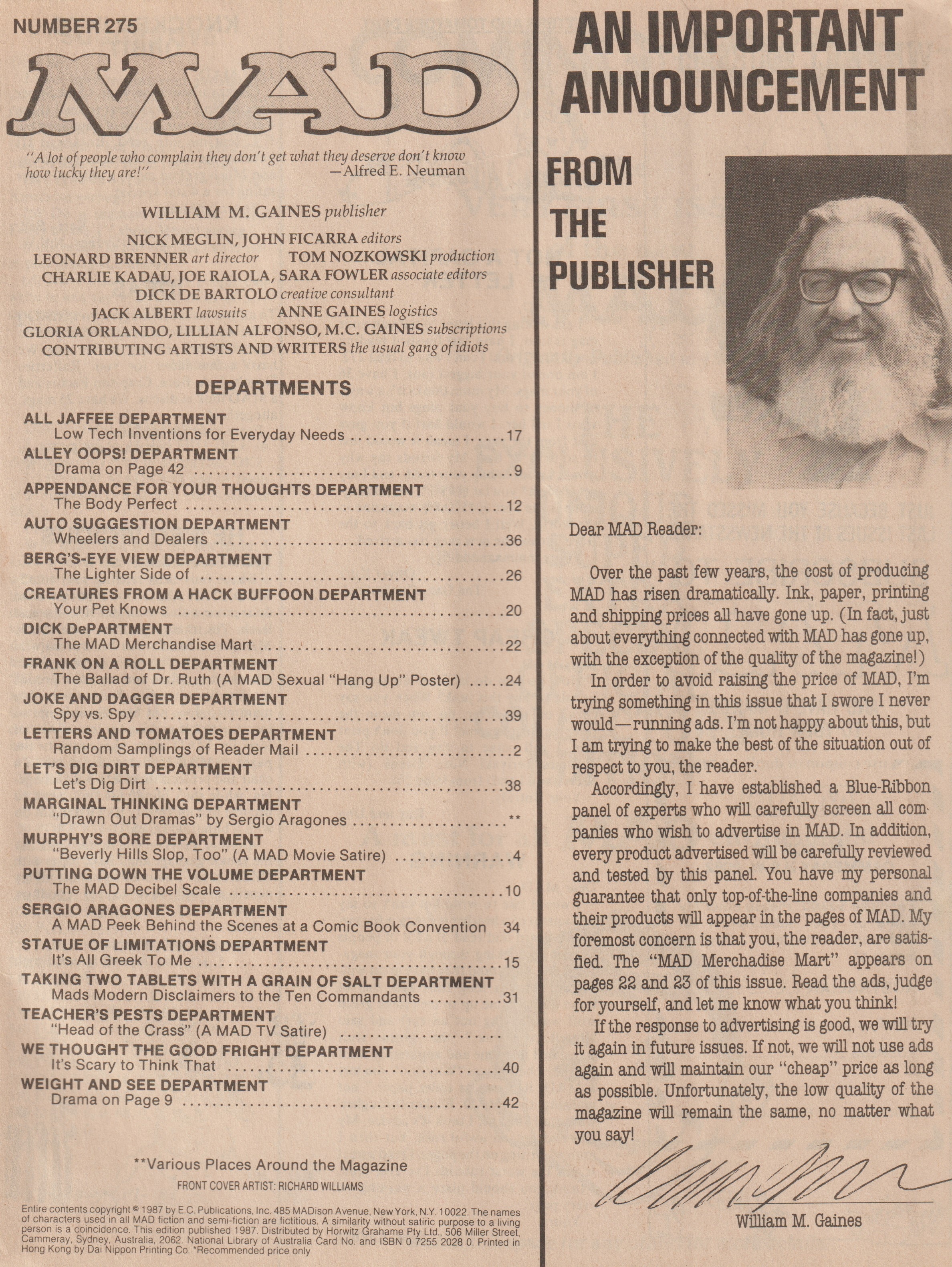 MAD Magazine #275 MAD Magazine (Australia) Updated: 0000 © CollectMAD.com Country: AustraliaOriginal cover: MAD Magazine #275 • USA • 1st Edition - New York Additional Images Cover Variations USABrasilFinlandGreat BritainSouth Africa