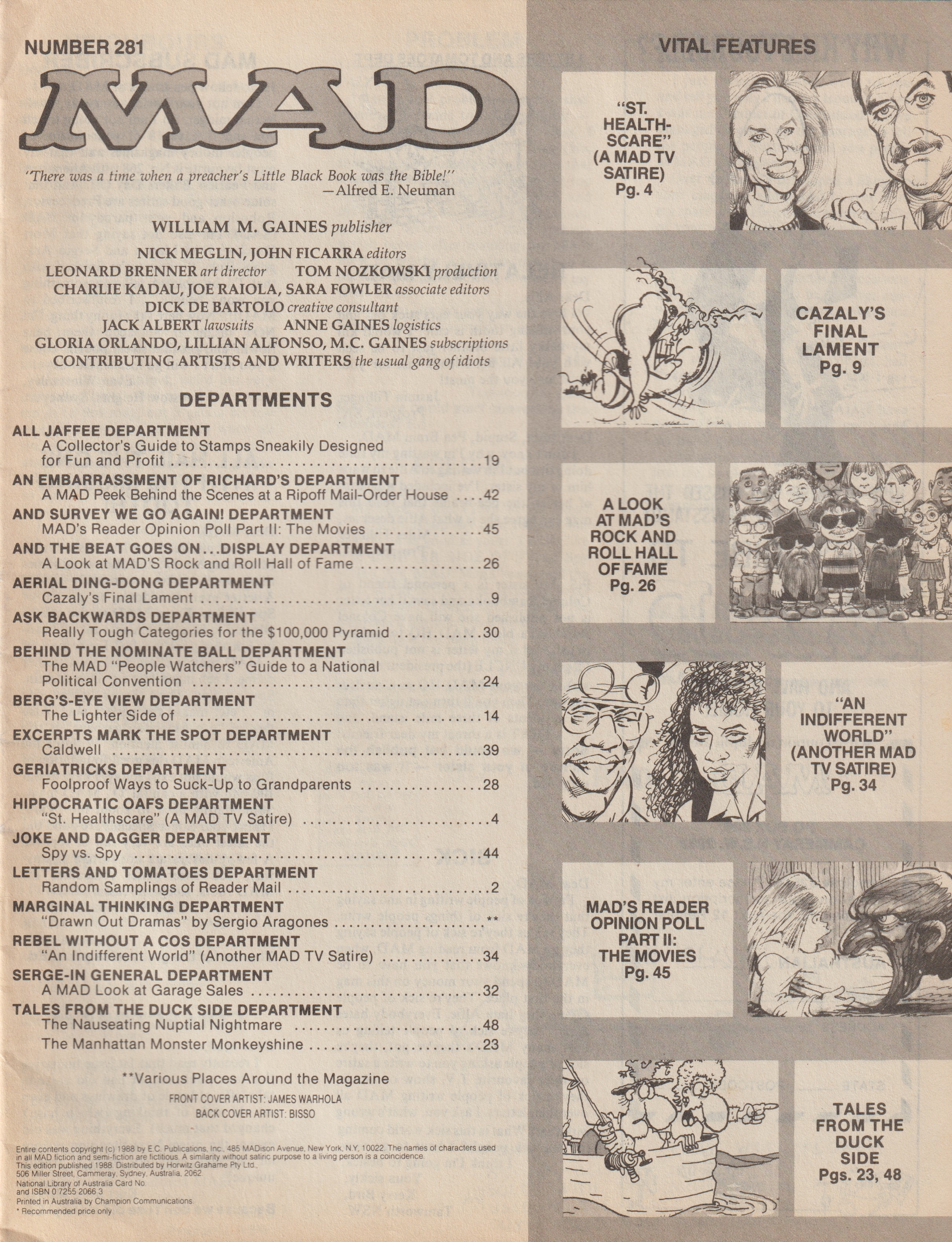 MAD Magazine #281 MAD Magazine (Australia) Updated: 0000 © CollectMAD.com Country: AustraliaOriginal cover: MAD Magazine #279 • USA • 1st Edition - New York Additional Images Cover Variations USAGreat BritainHungarySouth Africa