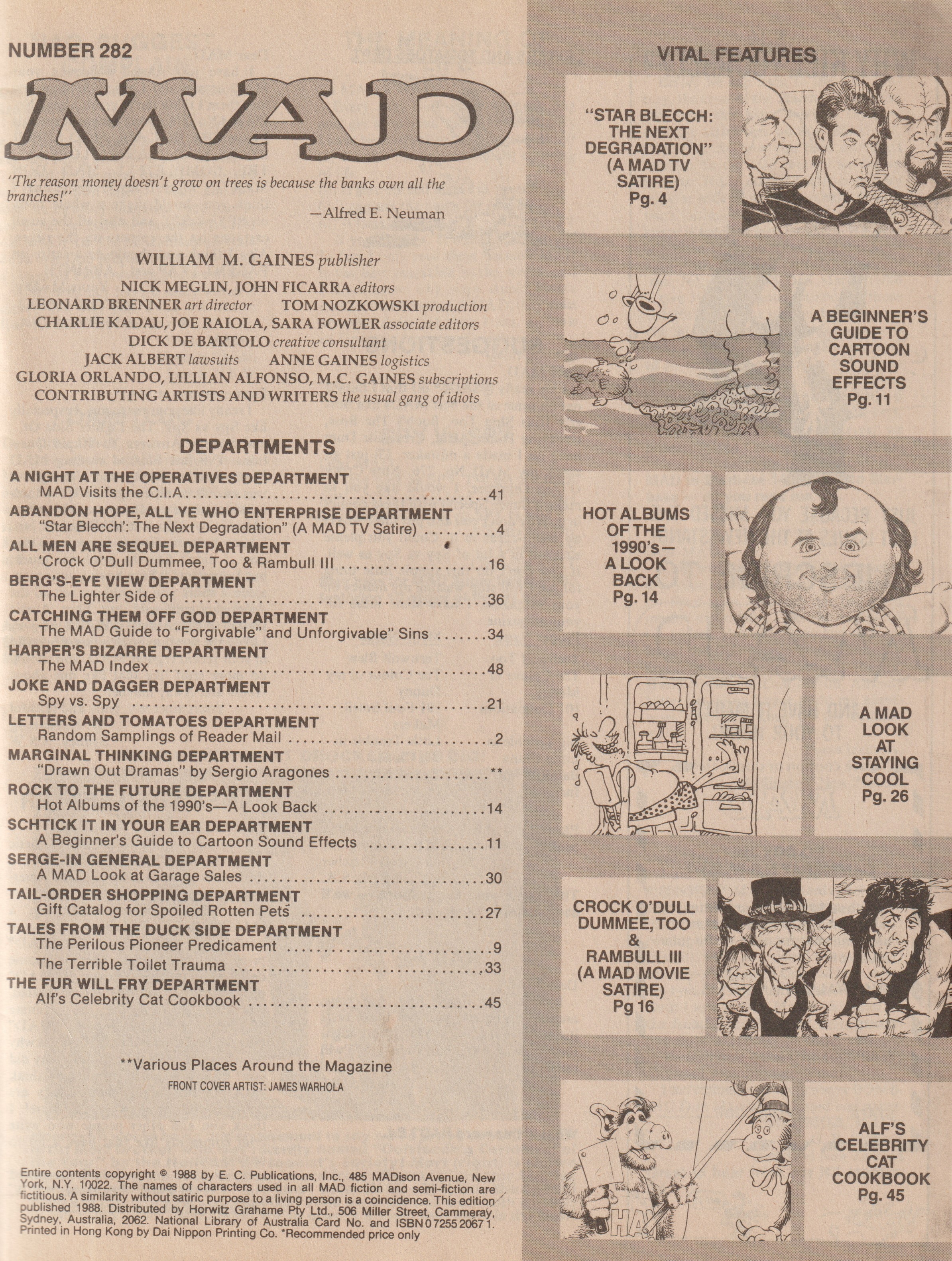 MAD Magazine #282 MAD Magazine (Australia) Updated: 0000 © CollectMAD.com Country: AustraliaOriginal cover: MAD Magazine #283 • USA • 1st Edition - New York Additional Images Cover Variations USABrasilFinlandGreat BritainSouth AfricaSweden
