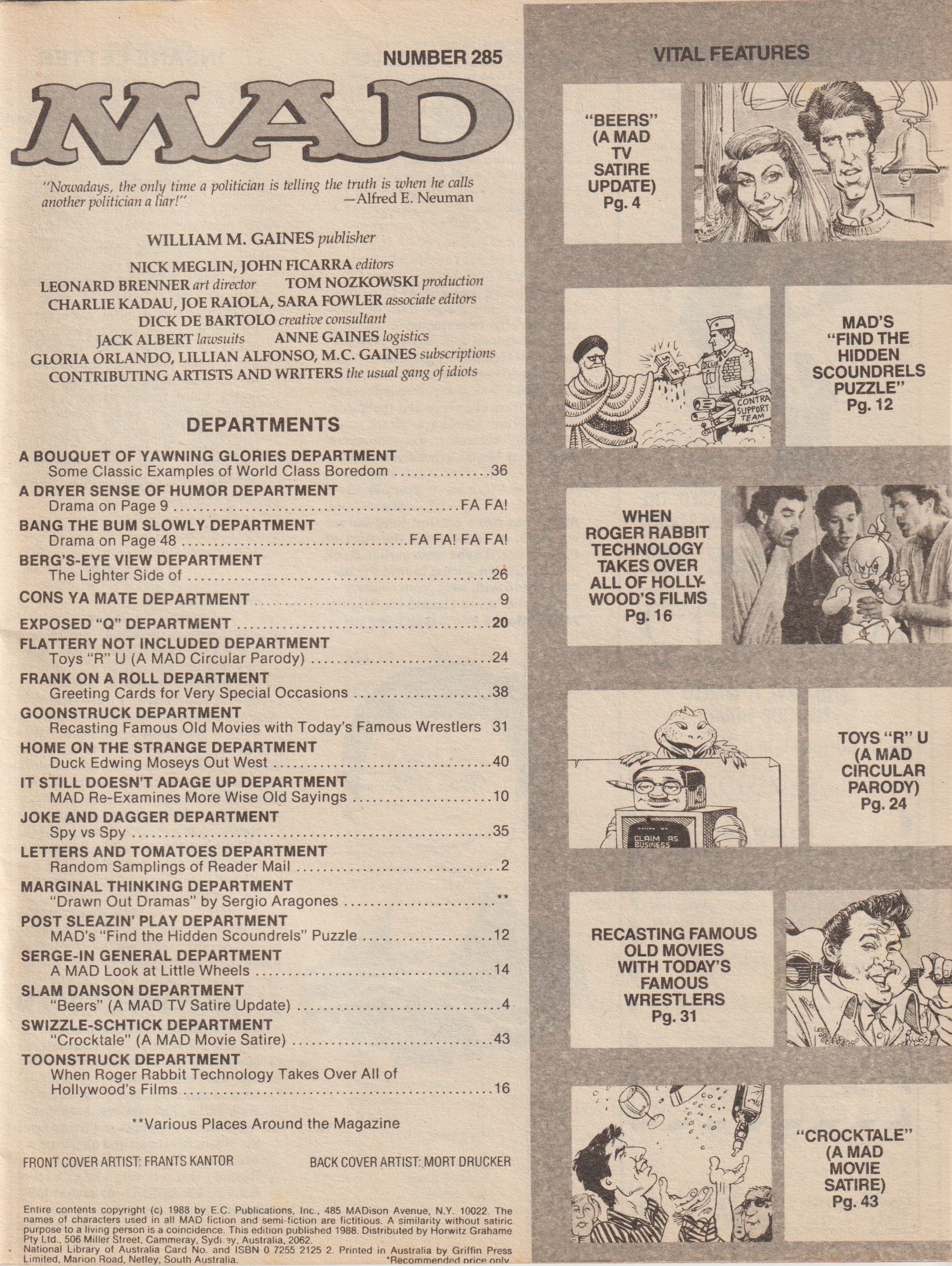 MAD Magazine #285 MAD Magazine (Australia) Updated: August 6th, 2021 Country: AustraliaCover: Cocktail - CheersSale price: AU$2.40Format: MagazineInserts: MAD Cricket Poster "This is not the front cover of MAD You've been CONNED AGAIN!" Editorial Cover Artist: Frantz Kantor Additional Images