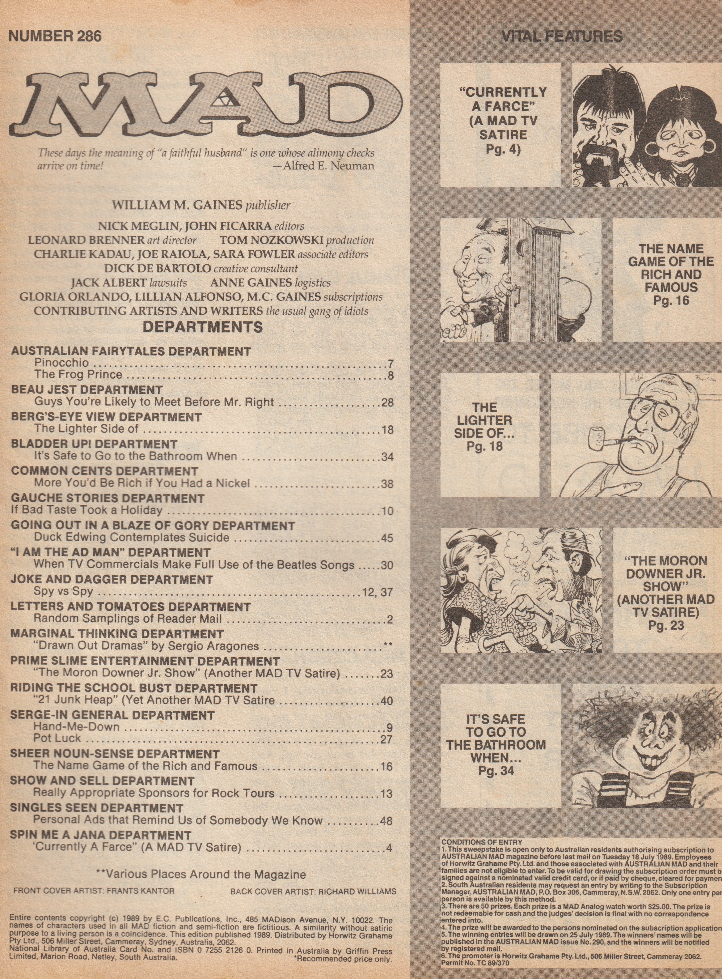 MAD Magazine #286 MAD Magazine (Australia) Updated: August 6th, 2021 Country: AustraliaCover: A Current AffairSale price: AU$2.40Format: Magazine Editorial Cover Artist: Frantz Kantor Additional Images