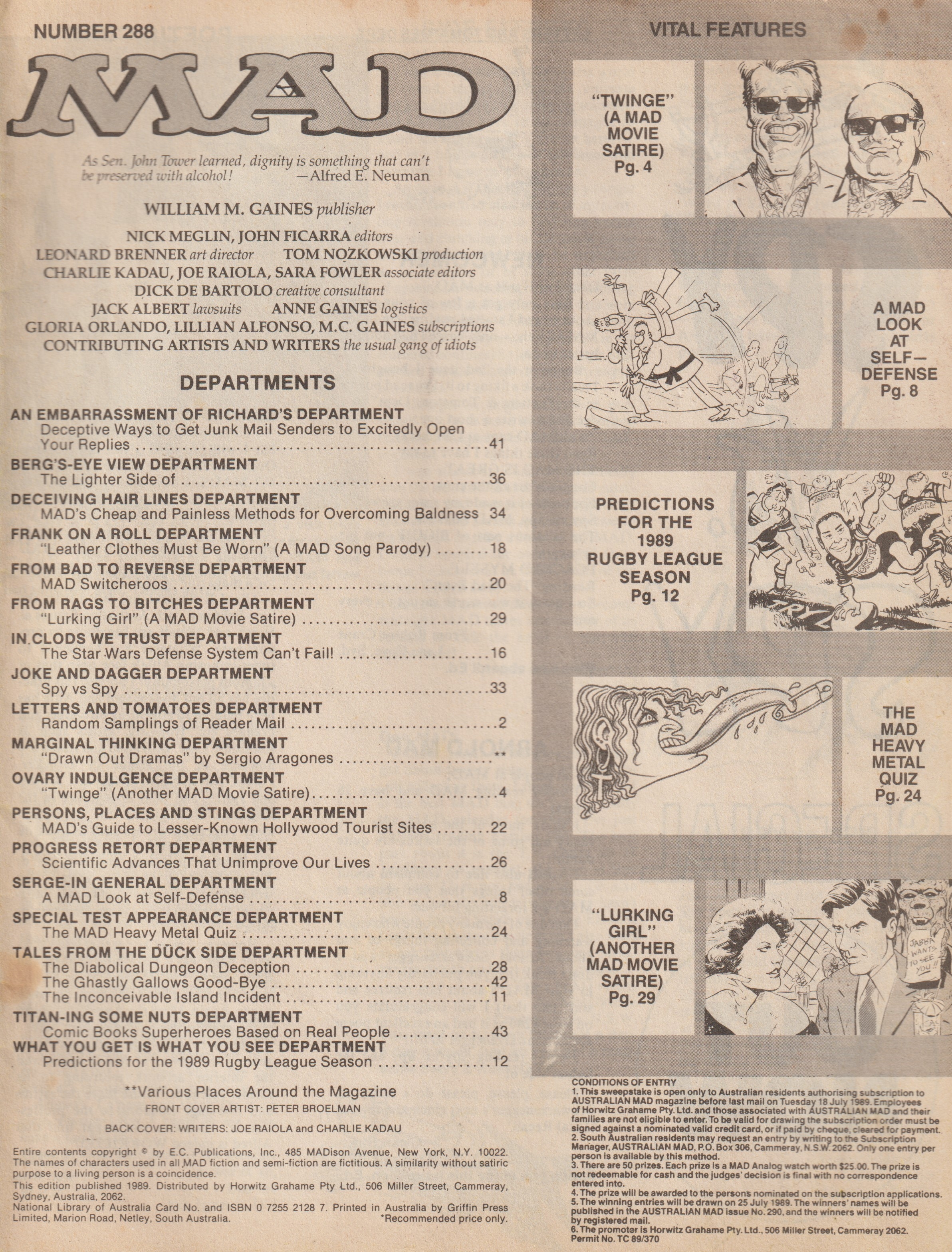 MAD Magazine #288 MAD Magazine (Australia) Updated: August 6th, 2021 Country: AustraliaCover: TwinsSale price: AU$2.40Format: Magazine Editorial Cover Artist: Peter Broelman Additional Images