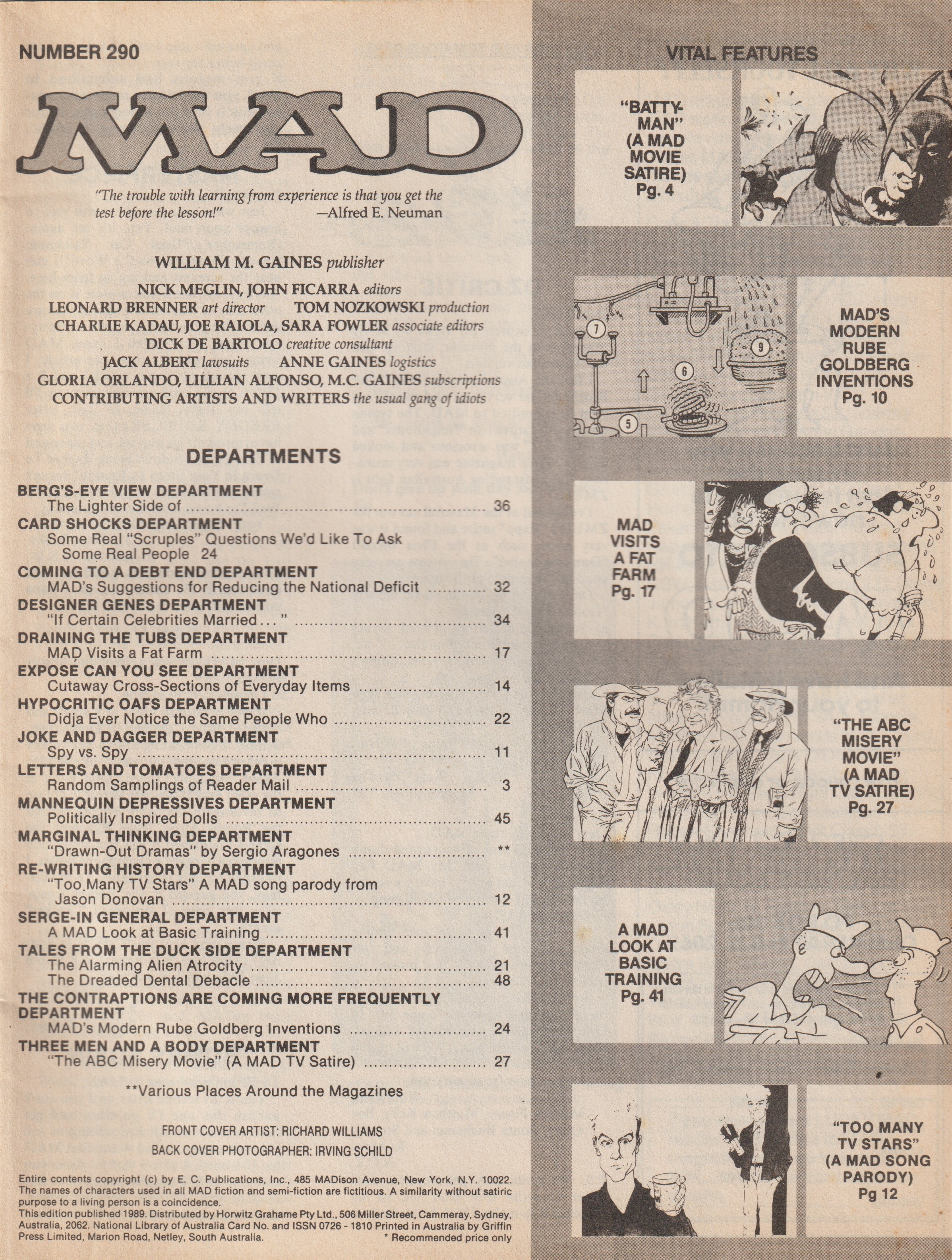 MAD Magazine #290 MAD Magazine (Australia) Updated: 0000 © CollectMAD.com Country: AustraliaOriginal cover: MAD Magazine #289 • USA • 1st Edition - New York Additional Images Cover Variations USABrasilDenmarkFinlandGreat BritainGermanyNetherlandsSouth AfricaSweden
