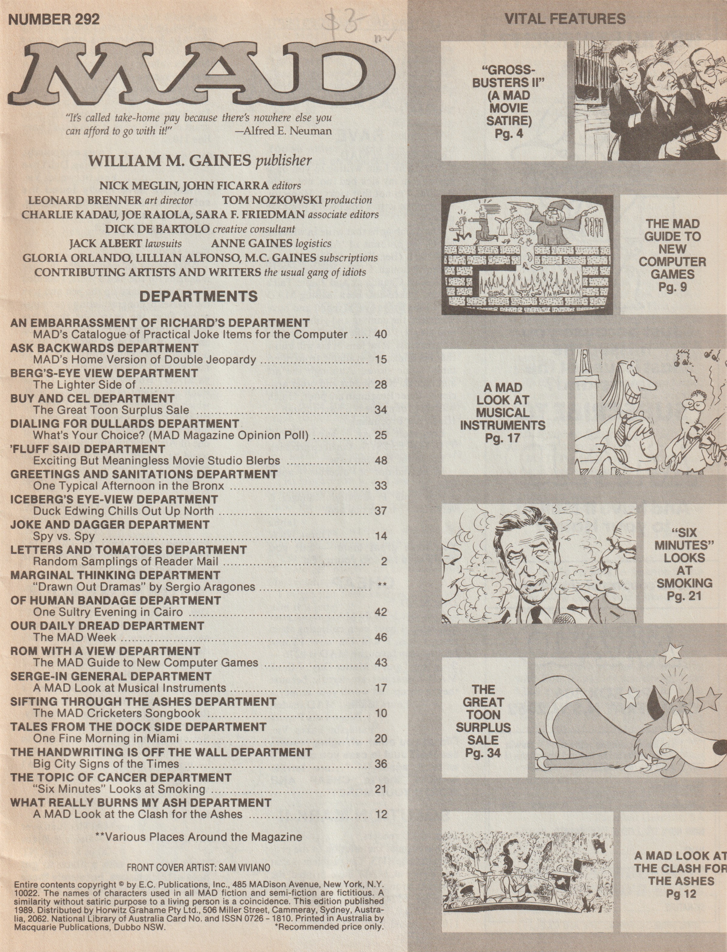 MAD Magazine #292 MAD Magazine (Australia) Updated: 0000 © CollectMAD.com Country: AustraliaOriginal cover: MAD Magazine #290 • USA • 1st Edition - New York Additional Images Cover Variations USABrasilFinlandGreat BritainGermanyNetherlandsMexicoSouth AfricaSweden