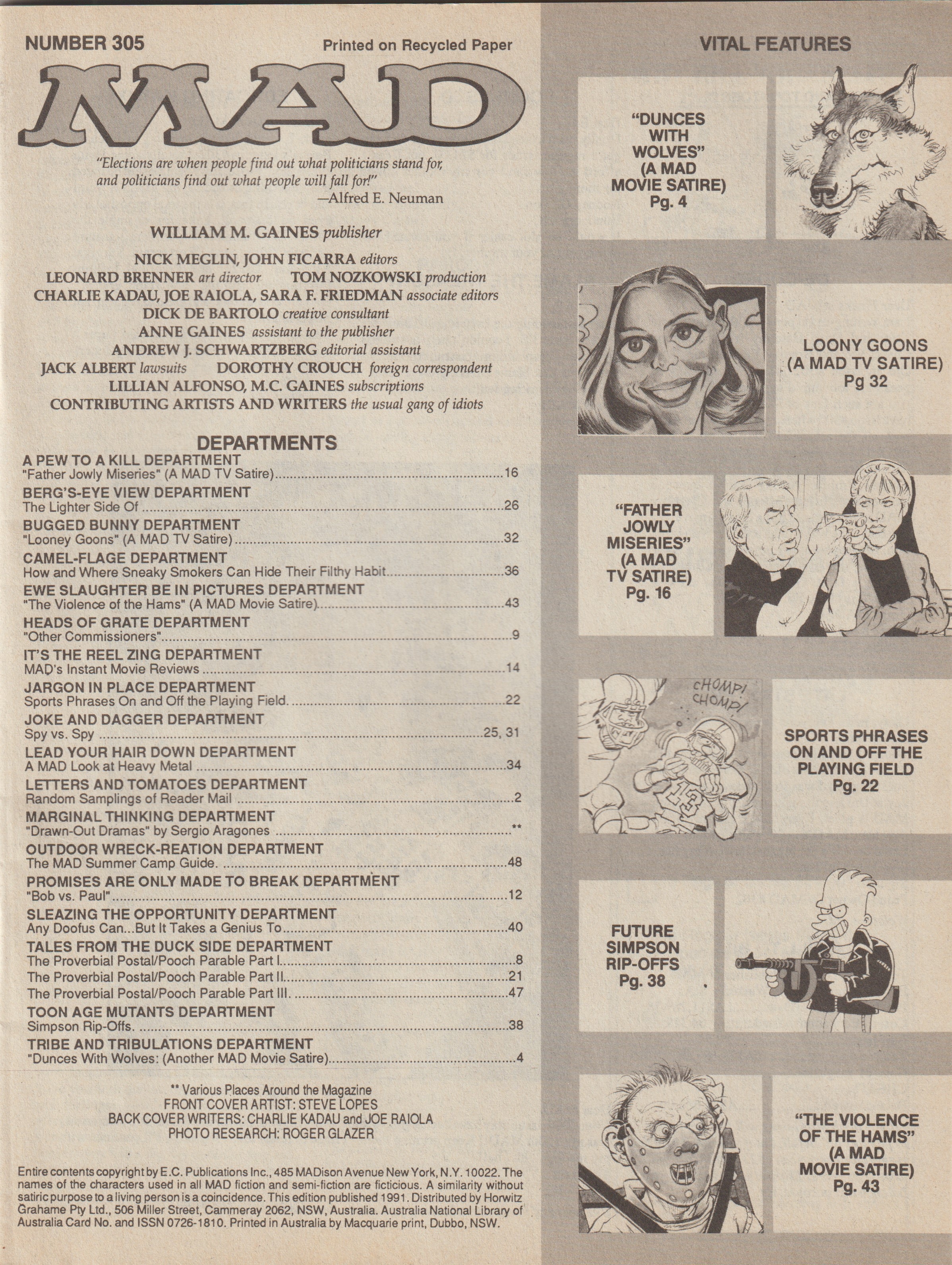 MAD Magazine #305 MAD Magazine (Australia) Updated: July 28th, 2021 Country: AustraliaCover: Dances with the WolvesSale price: AU$2.95Format: Magazine Editorial Cover Artist: Steve Lopes Additional Images
