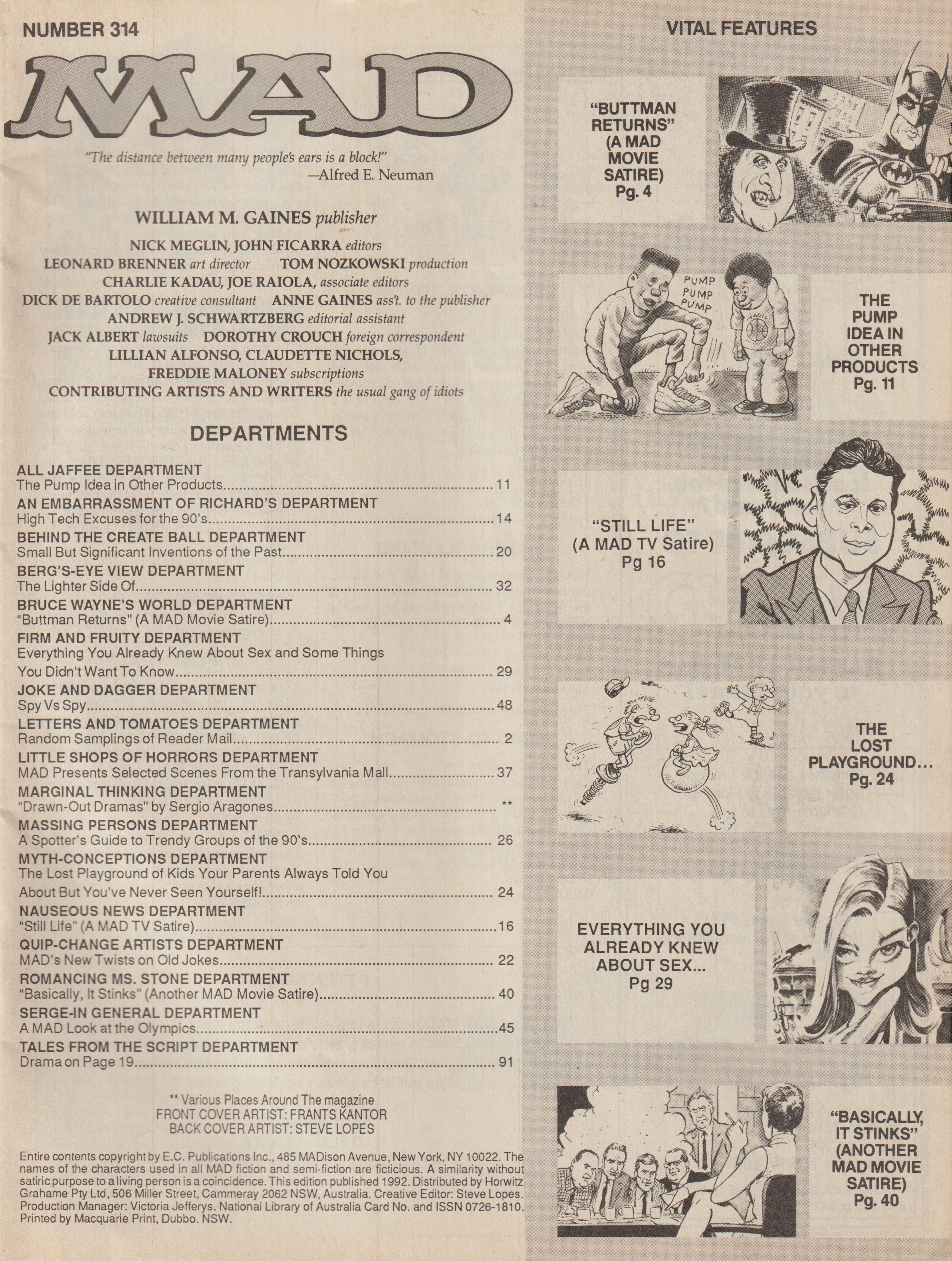 MAD Magazine #314 MAD Magazine (Australia) Updated: August 6th, 2021 Country: AustraliaCover: In This Issue Clip Batman ReturnsSale price: AU$2.95Format: Magazine Editorial Cover Artist: Frantz Kantor Additional Images