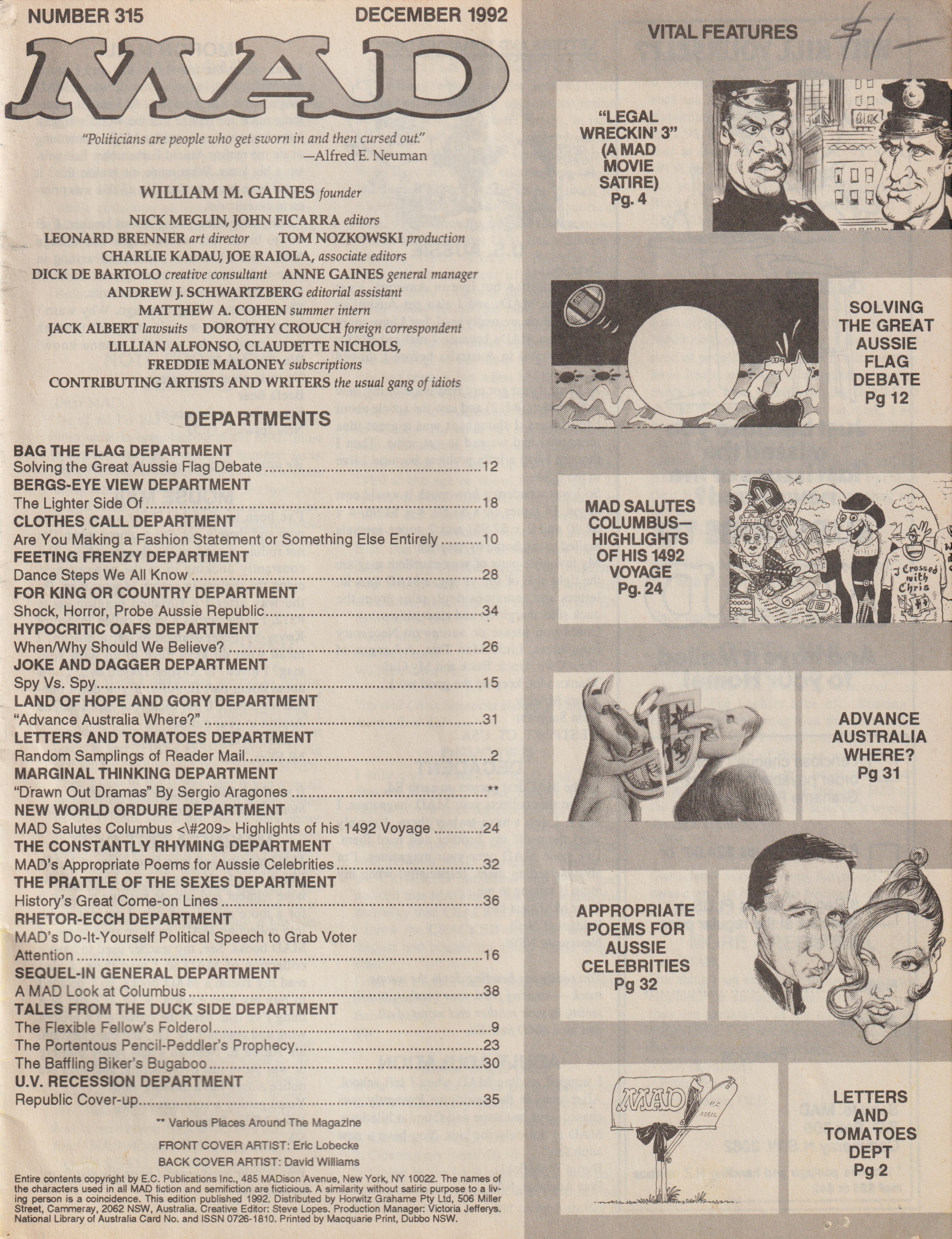 MAD Magazine #315 MAD Magazine (Australia) Updated: August 8th, 2021 Country: AustraliaCover: Alfred for Head of EverythingSale price: AU$2.95Format: Magazine Editorial Cover Artist: Eric Lobbecke Additional Images