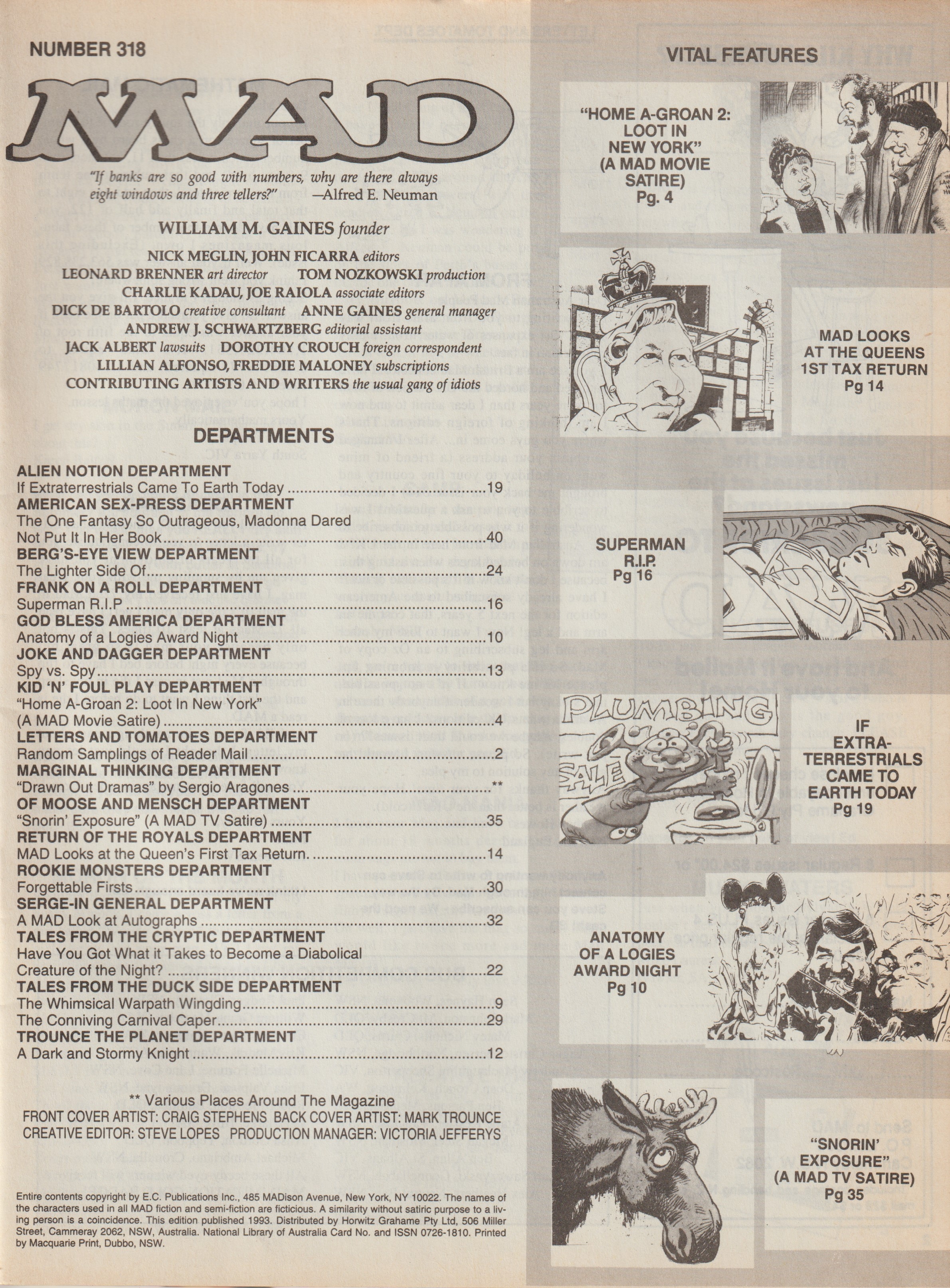 MAD Magazine #318 MAD Magazine (Australia) Updated: August 10th, 2021 Country: AustraliaCover: TV GeekSale price: AU$2.95Format: Magazine Editorial Cover Artist: Craig Stephens Additional Images