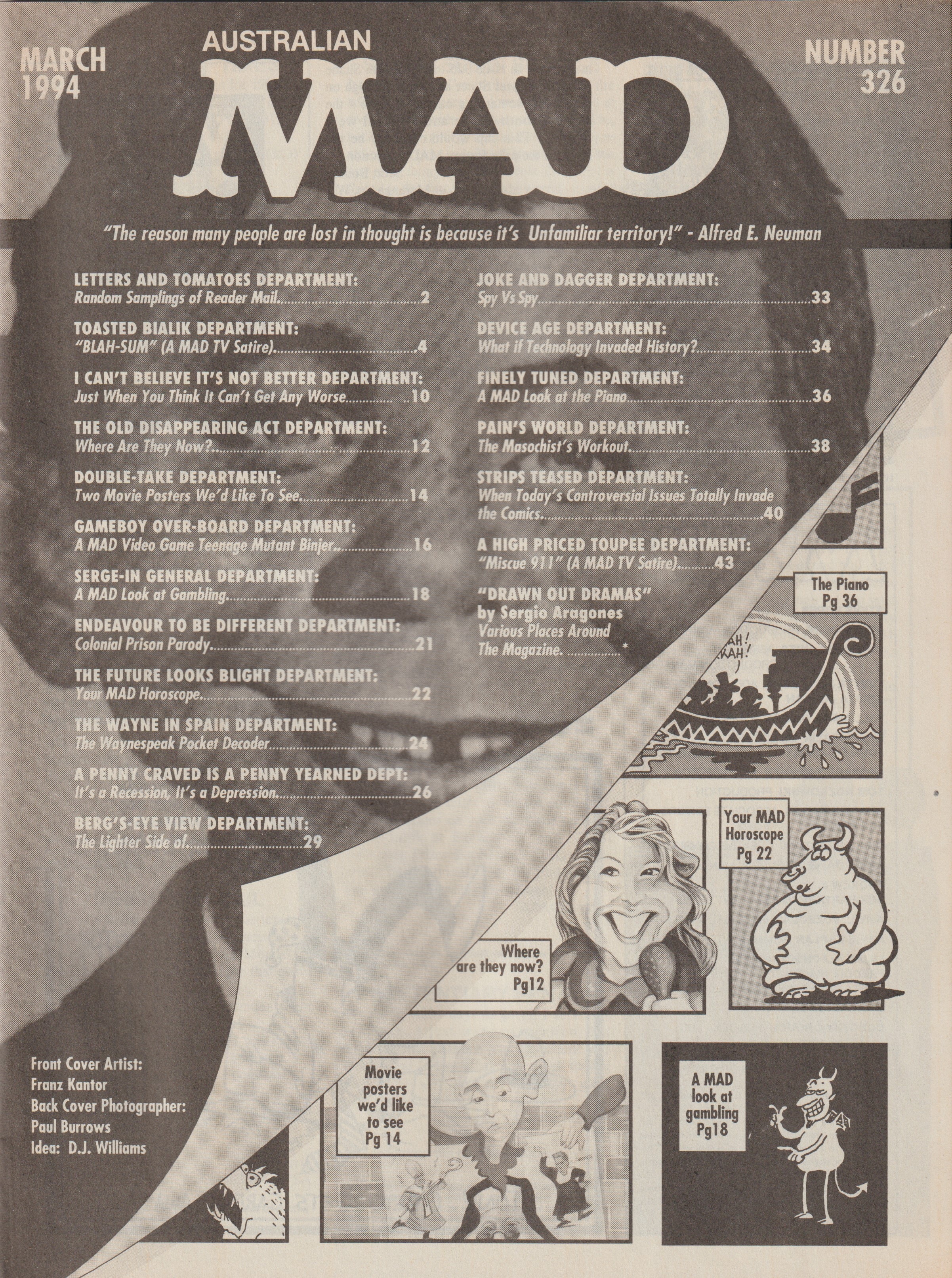 MAD Magazine #326 MAD Magazine (Australia) Updated: July 28th, 2021 Country: AustraliaCover: Predictably MAD - You will buy this issueSale price: AU$2.95Format: Magazine Editorial Cover Artist: Steve Lopes Additional Images