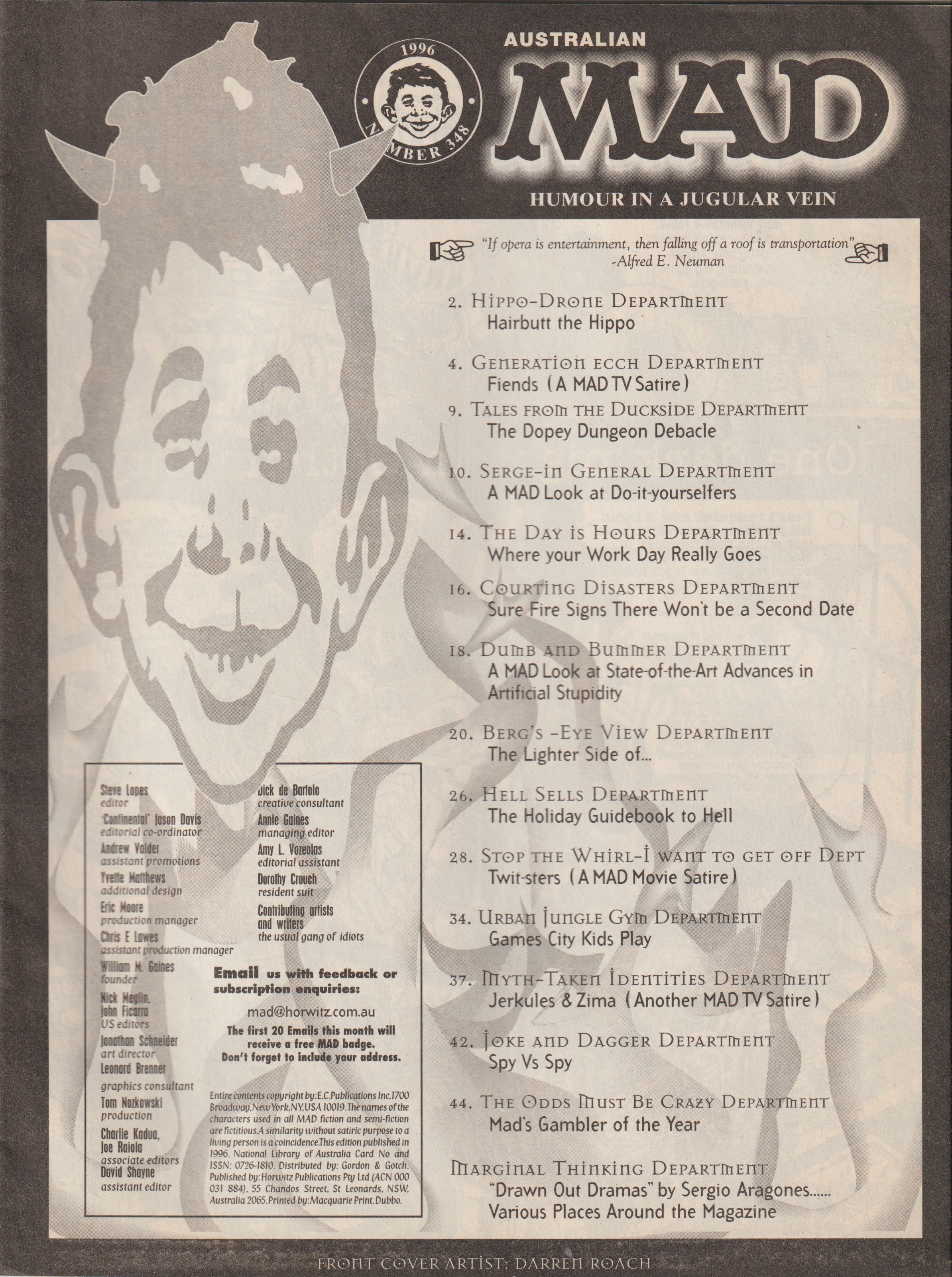 MAD Magazine #348 MAD Magazine (Australia) Updated: July 28th, 2021 Country: AustraliaCompany: Horwitz PublicationsCover: The Issue from Hell!Sale price: AU$3.60Format: Magazine Editorial Cover Artist: Darren Roach Additional Images