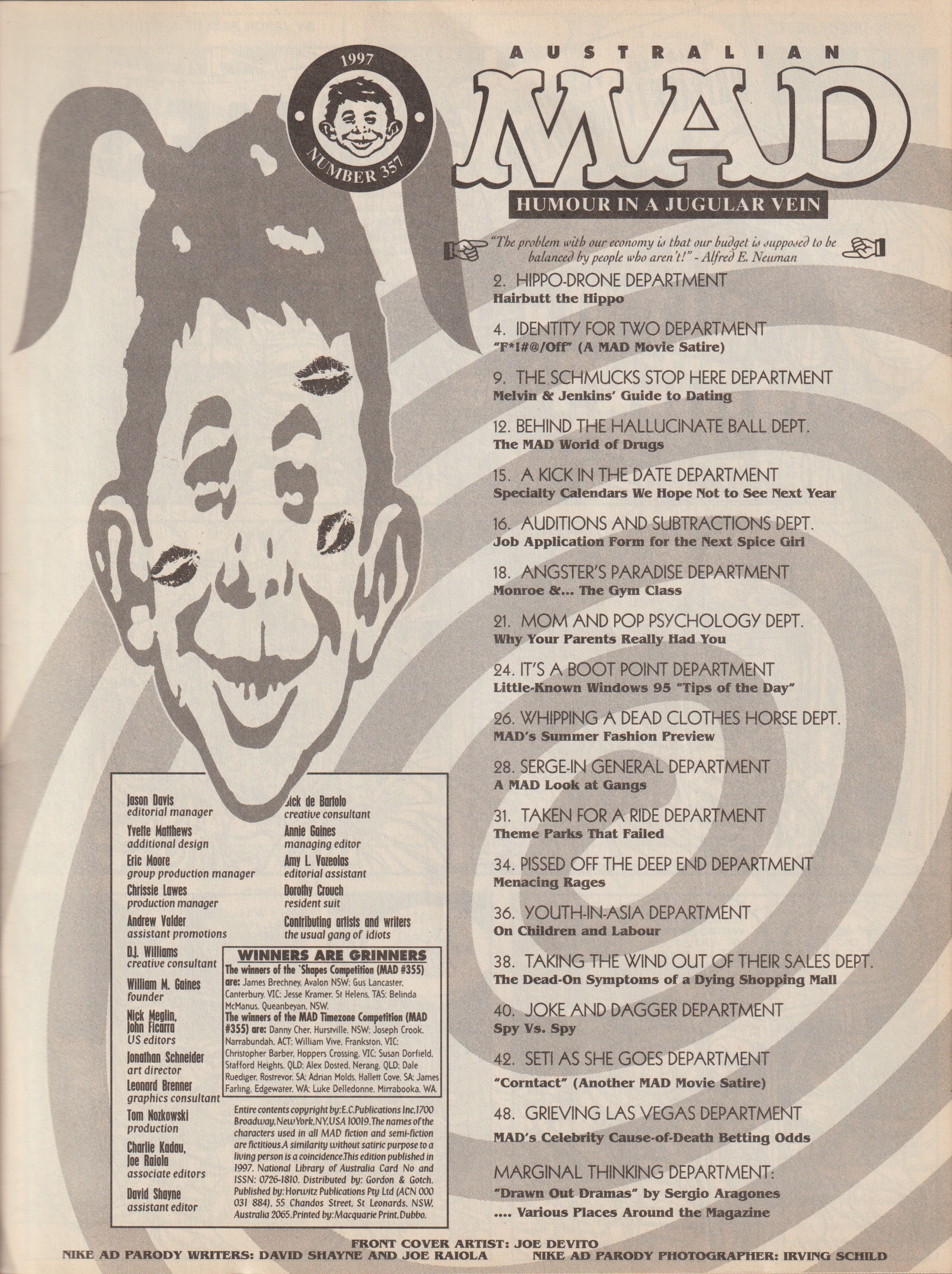 MAD Magazine #357 MAD Magazine (Australia) Updated: 0000 © CollectMAD.com Country: AustraliaOriginal cover: MAD Magazine #363 • USA • 1st Edition - New York Editorial Editor: Dave Williams Additional Images Cover Variations USADenmarkFinlandGreeceHungaryIndiaSouth AfricaSweden