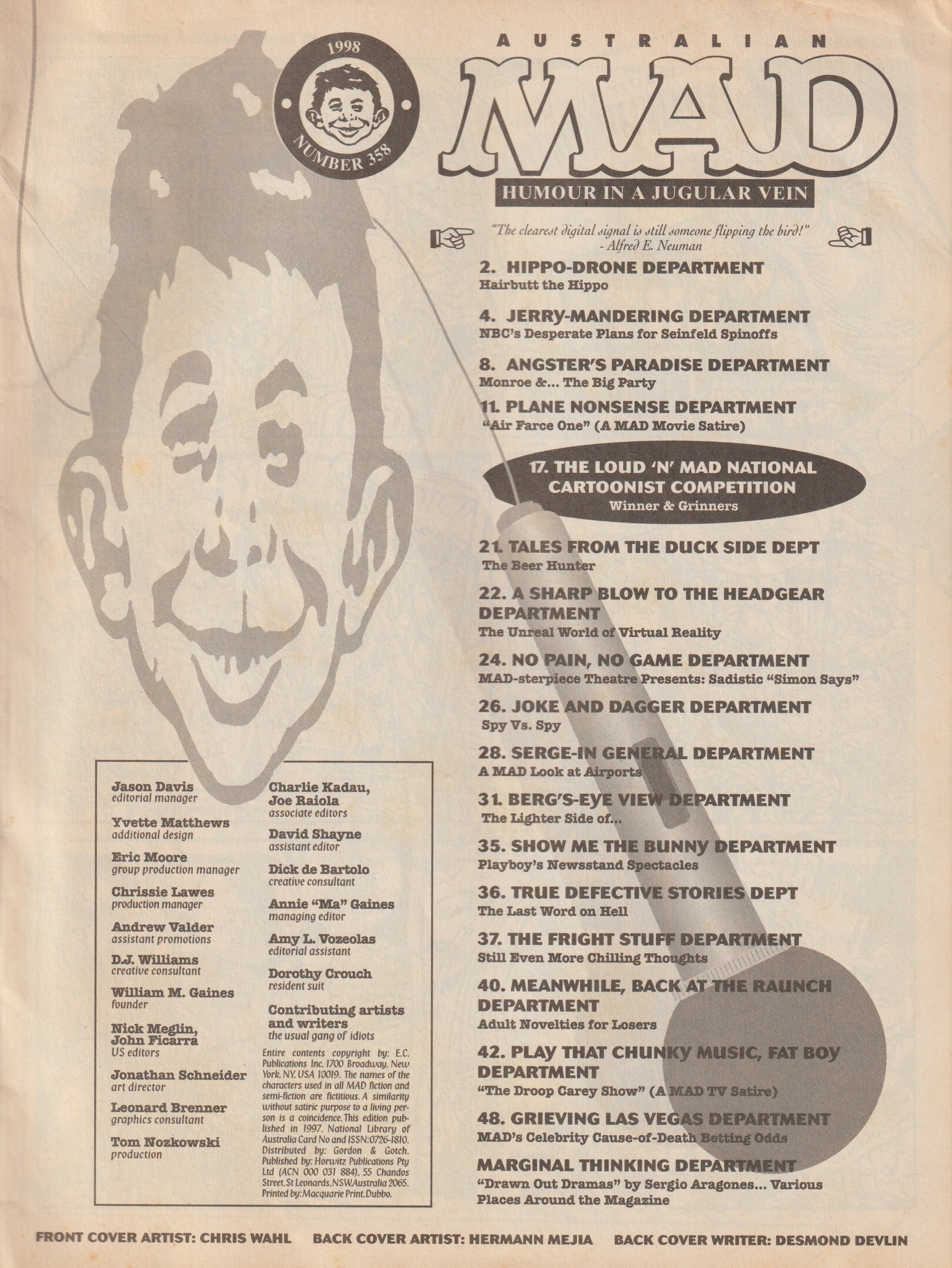 MAD Magazine #358 MAD Magazine (Australia) Updated: 0000 © CollectMAD.com Country: AustraliaOriginal cover: MAD Magazine #364 • USA • 1st Edition - New York Editorial Editor: Dave Williams Additional Images Cover Variations USASouth Africa