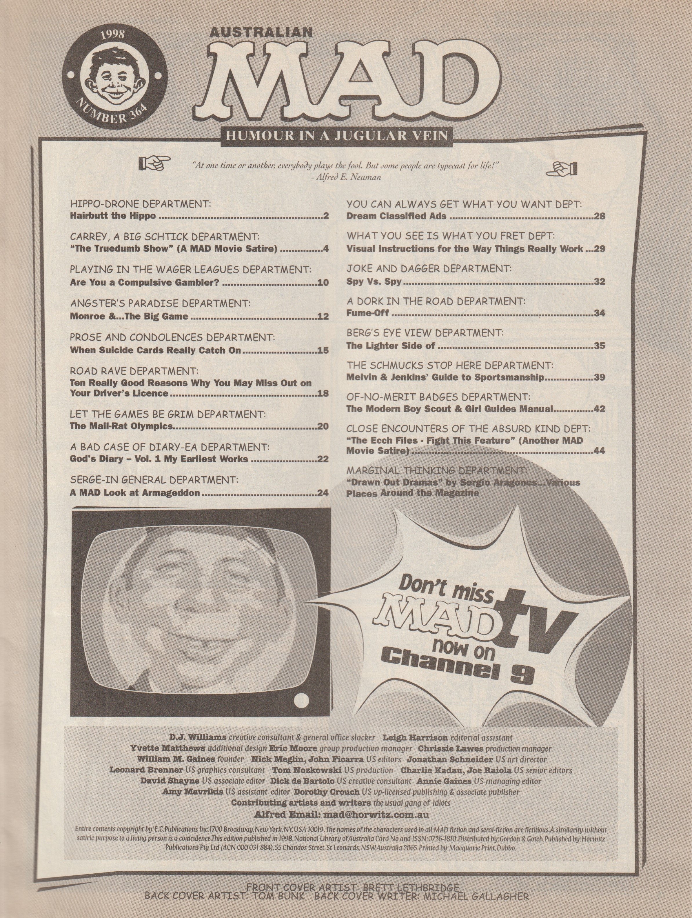 MAD Magazine #364 MAD Magazine (Australia) Updated: August 10th, 2021 Country: AustraliaCover: The Trueman Show - Tune in and get turned offSale price: AU$3.70Format: Magazine Editorial Editor: Dave WilliamsCover Artist: Brett Lethbridge Additional Images