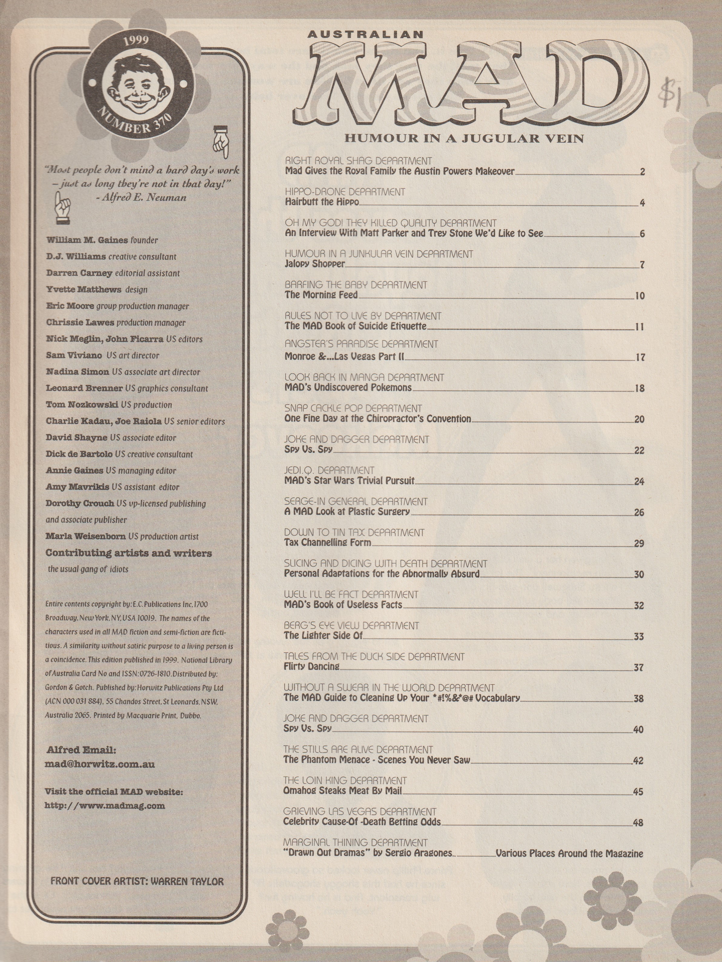 MAD Magazine #370 MAD Magazine (Australia) Updated: August 6th, 2021 Country: AustraliaCover: The Spy Who Gagged MeSale price: AU$3.95Format: Magazine Editorial Editor: Dave WilliamsCover Artist: Deane Taylor Additional Images