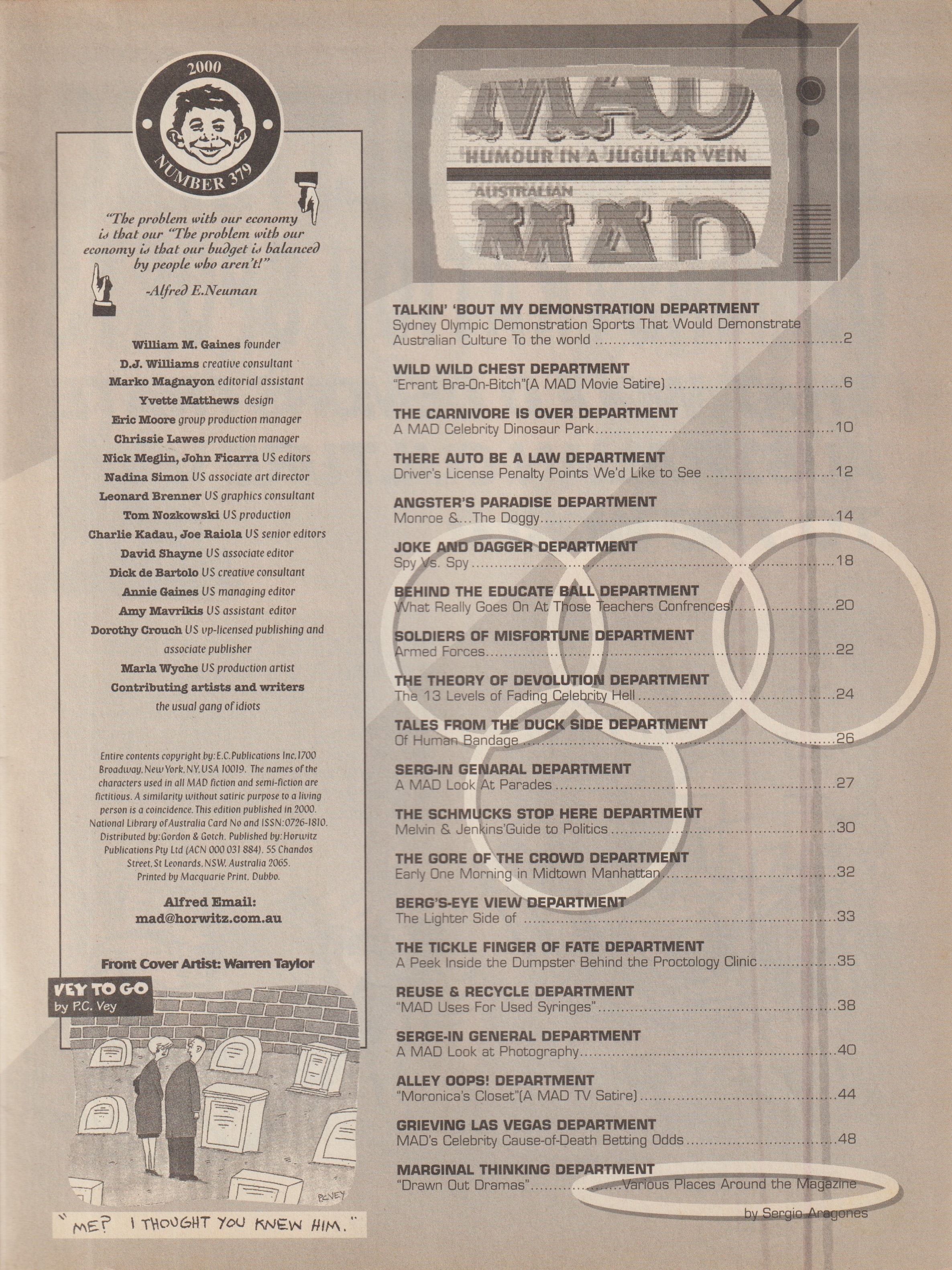 MAD Magazine #379 MAD Magazine (Australia) Updated: August 6th, 2021 Country: AustraliaCover: Olympics - Dinosaurs - Double SergioSale price: AU$4.35Format: Magazine Editorial Editor: Dave WilliamsCover Artist: Deane Taylor Additional Images