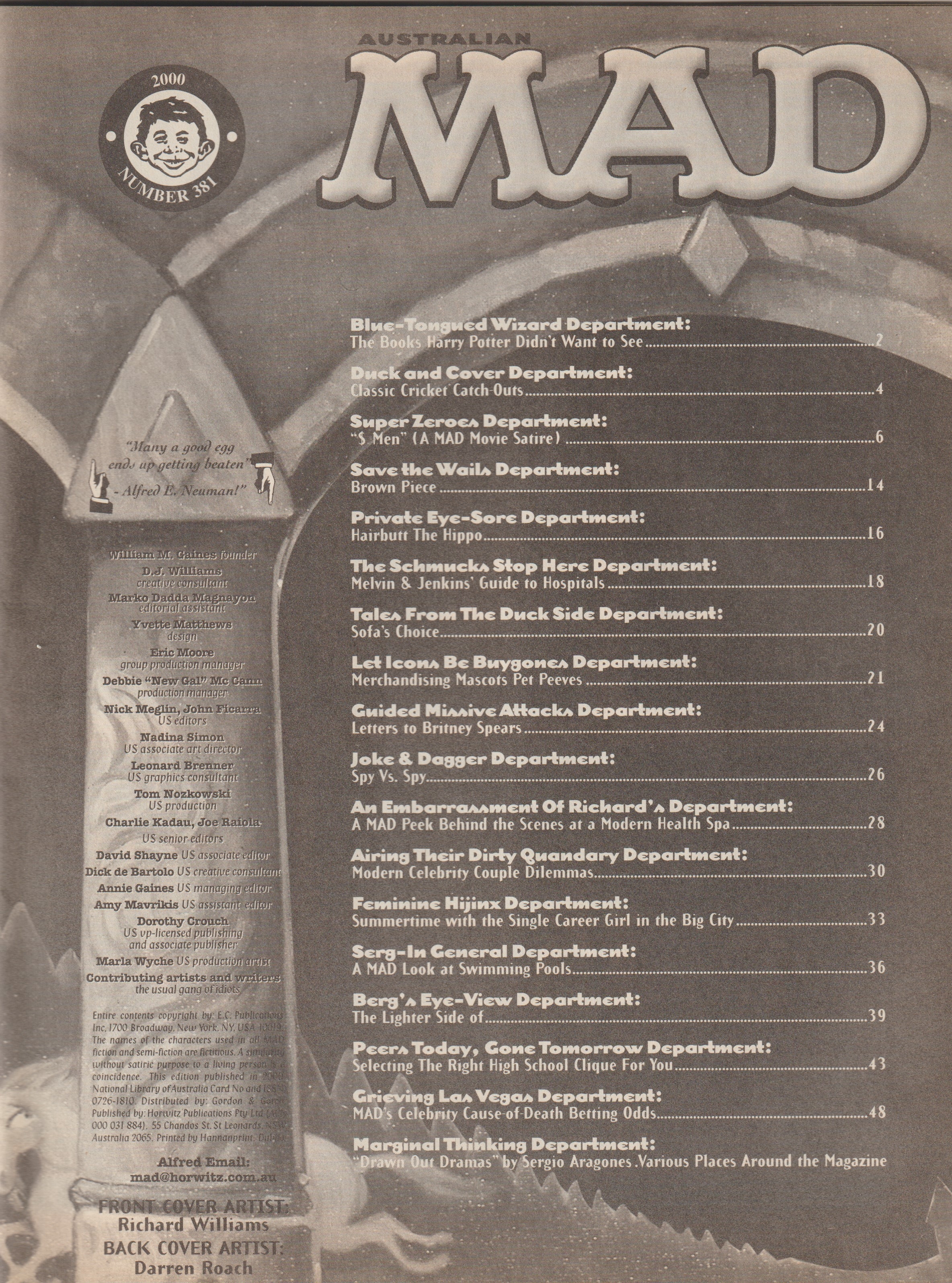 MAD Magazine #381 MAD Magazine (Australia) Updated: 0000 © CollectMAD.com Country: AustraliaOriginal cover: MAD Magazine #391 • USA • 1st Edition - New York Editorial Editor: Dave Williams Additional Images Cover Variations USABrasilFinlandSweden
