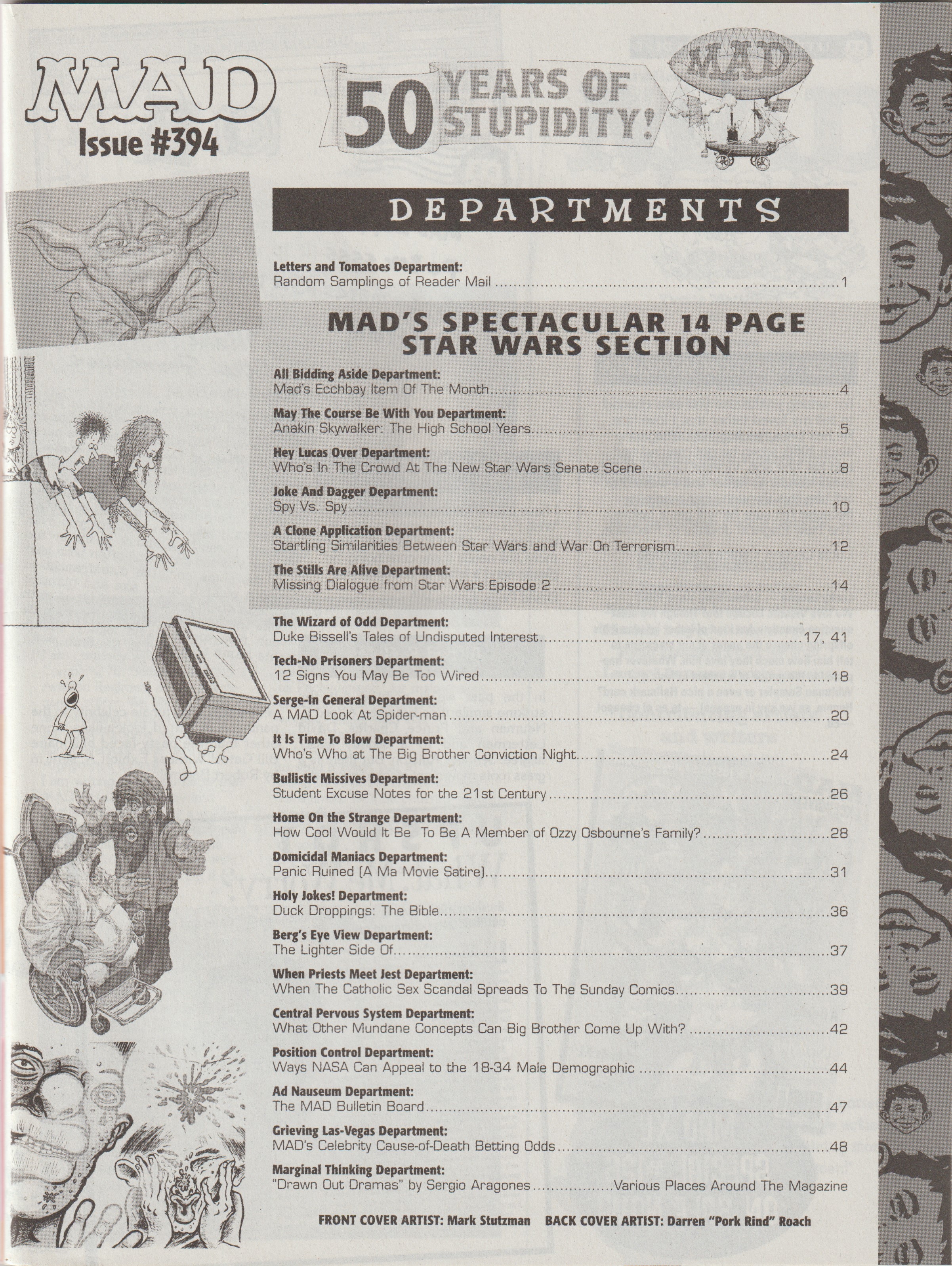 MAD Magazine #394 MAD Magazine (Australia) Updated: July 28th, 2021 © CollectMAD.com Country: AustraliaCover: Star WarsOriginal cover: MAD Magazine #419 • USA • 1st Edition - New YorkSale price: AU$4.70Format: Magazine Editorial Editor: Dave WilliamsBack Cover Artist: Darren Roach Additional Images Cover Variations USAFinlandSouth AfricaSpain