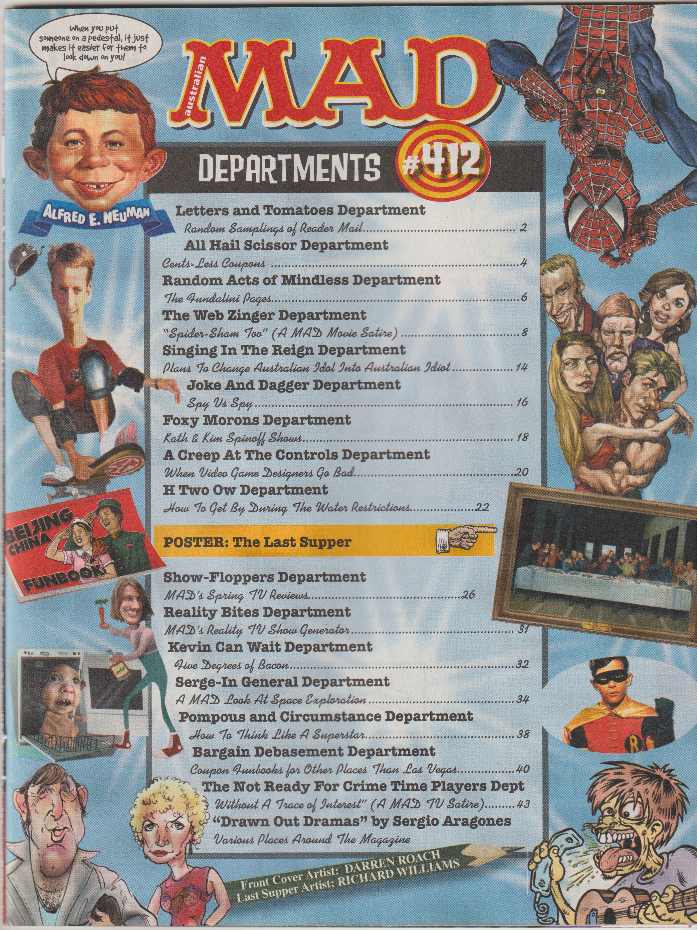 MAD Magazine #412 MAD Magazine (Australia) Updated: July 28th, 2021 Country: AustraliaCover: Australian IdolSale price: AU$5.50Format: Magazine Editorial Editor: Dave WilliamsCover Artist: Darren Roach Additional Images