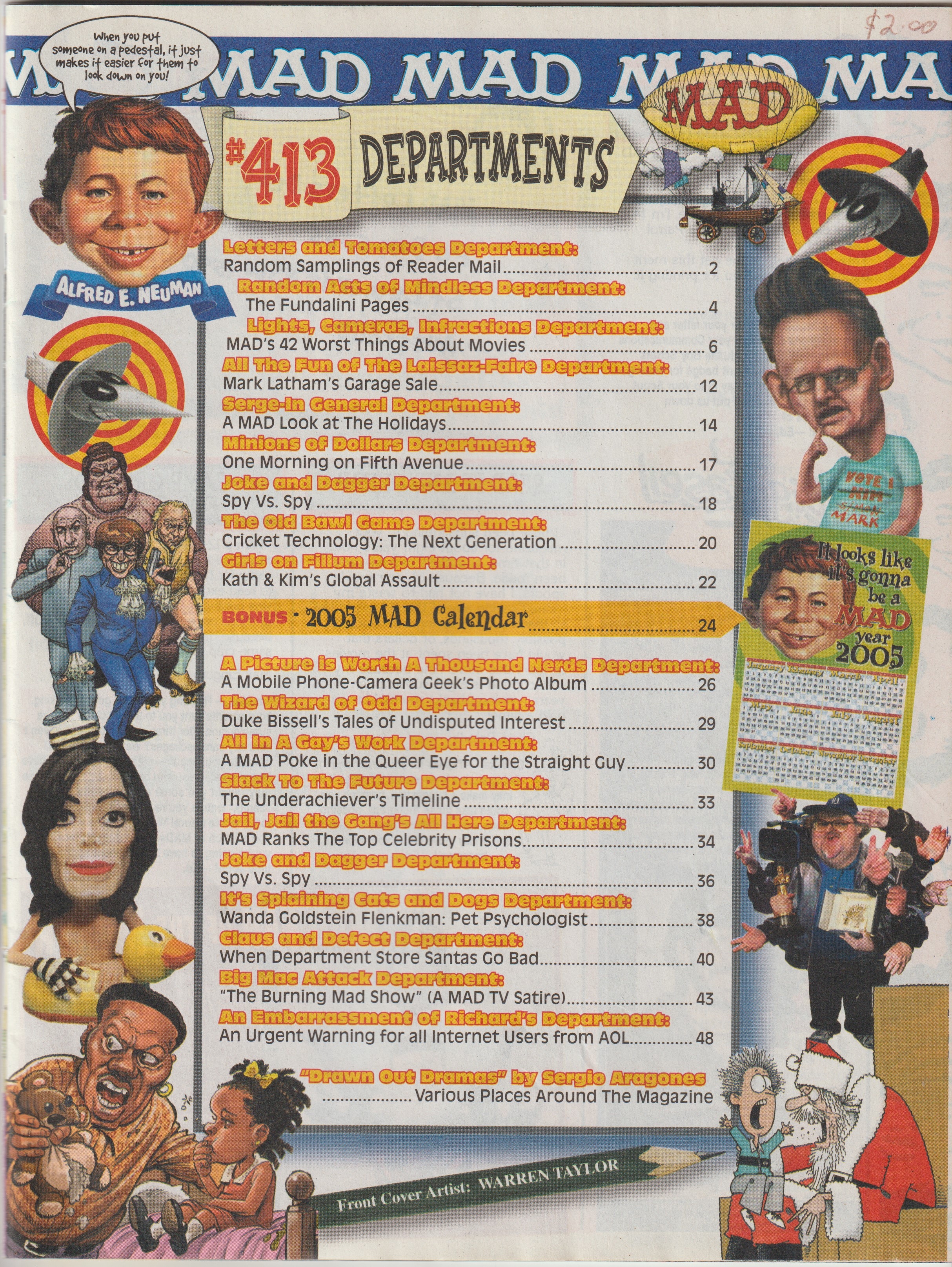 MAD Magazine #413 MAD Magazine (Australia) Updated: August 6th, 2021 Country: AustraliaCover: The 42 worst things about MoviesSale price: AU$5.50Format: Magazine Editorial Editor: Dave WilliamsCover Artist: Deane Taylor Additional Images