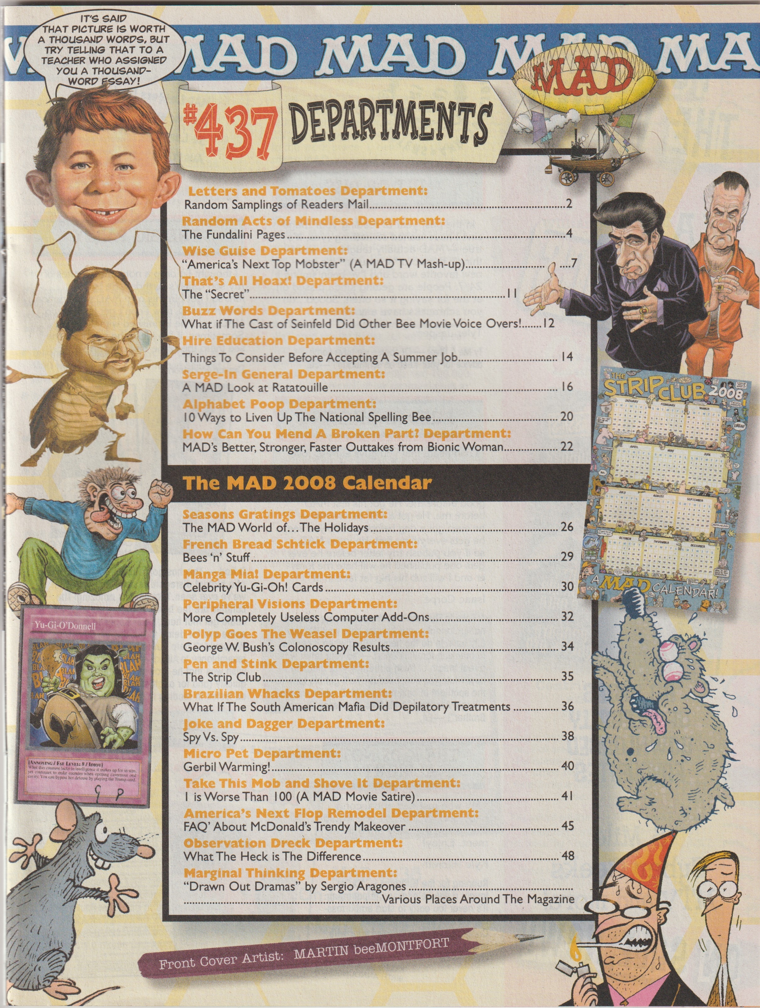 MAD Magazine #437 MAD Magazine (Australia) Updated: 0000 © CollectMAD.com Country: AustraliaCompany: Horwitz PublicationsCover: We take a swat at Bee MovieOriginal cover: MAD Magazine #57 • USA • 1st Edition - New YorkSale price: AU$5.50 Editorial Editor: Dave WilliamsCover Artist: Martin deMontfort Additional Images Cover Variations USADenmarkGreat BritainNetherlandsMexicoSweden