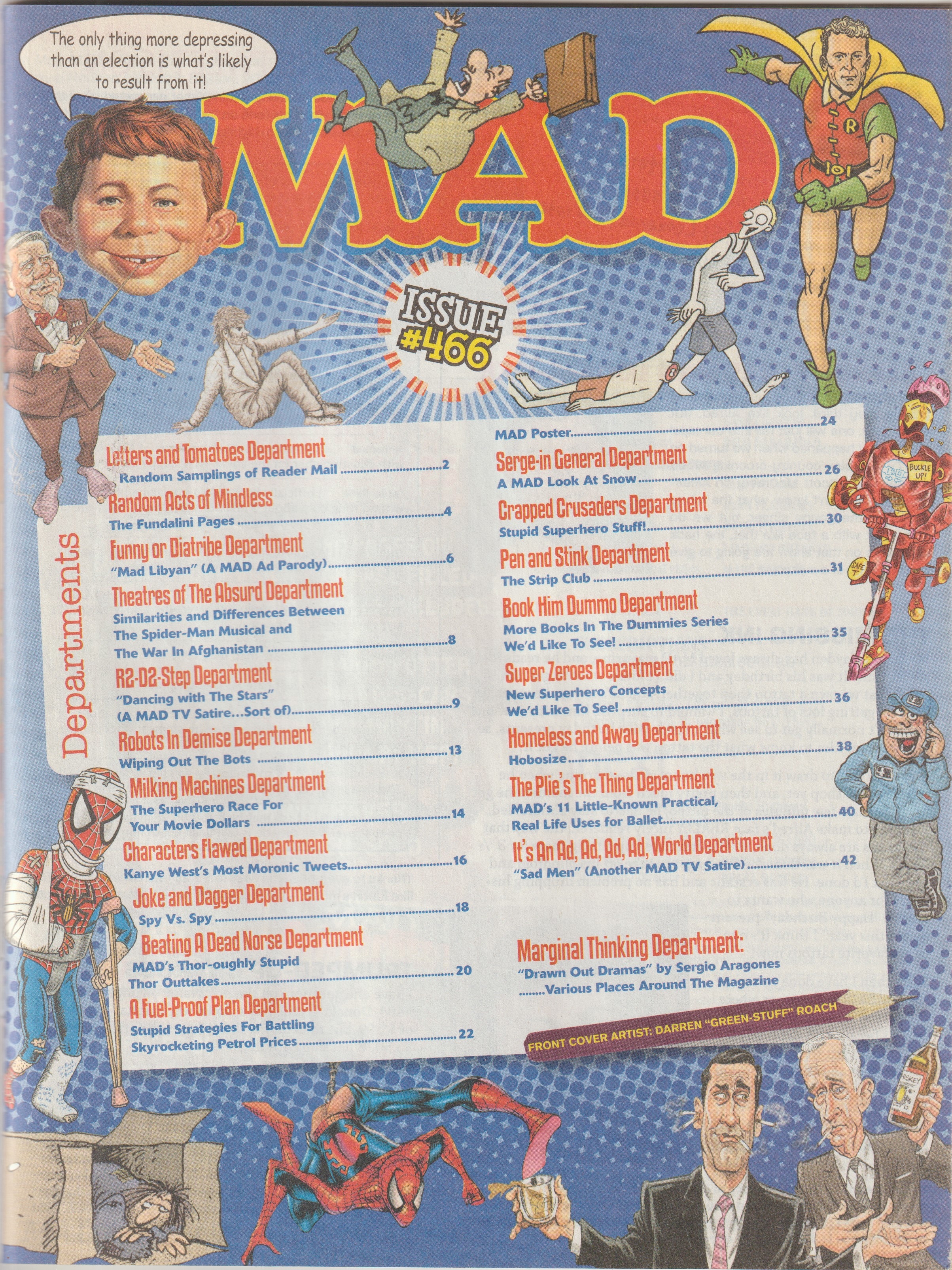 MAD Magazine #466 MAD Magazine (Australia) Updated: 0000 Country: AustraliaCompany: nextmedia Pty LtdPublished: September 1st, 2011Cover: Thor - Green Lantern - Captain America - X-MenSale price: AU$5.95Pages: 50 Editorial Editor: Dave WilliamsCover Artist: Darren Roach Additional Images