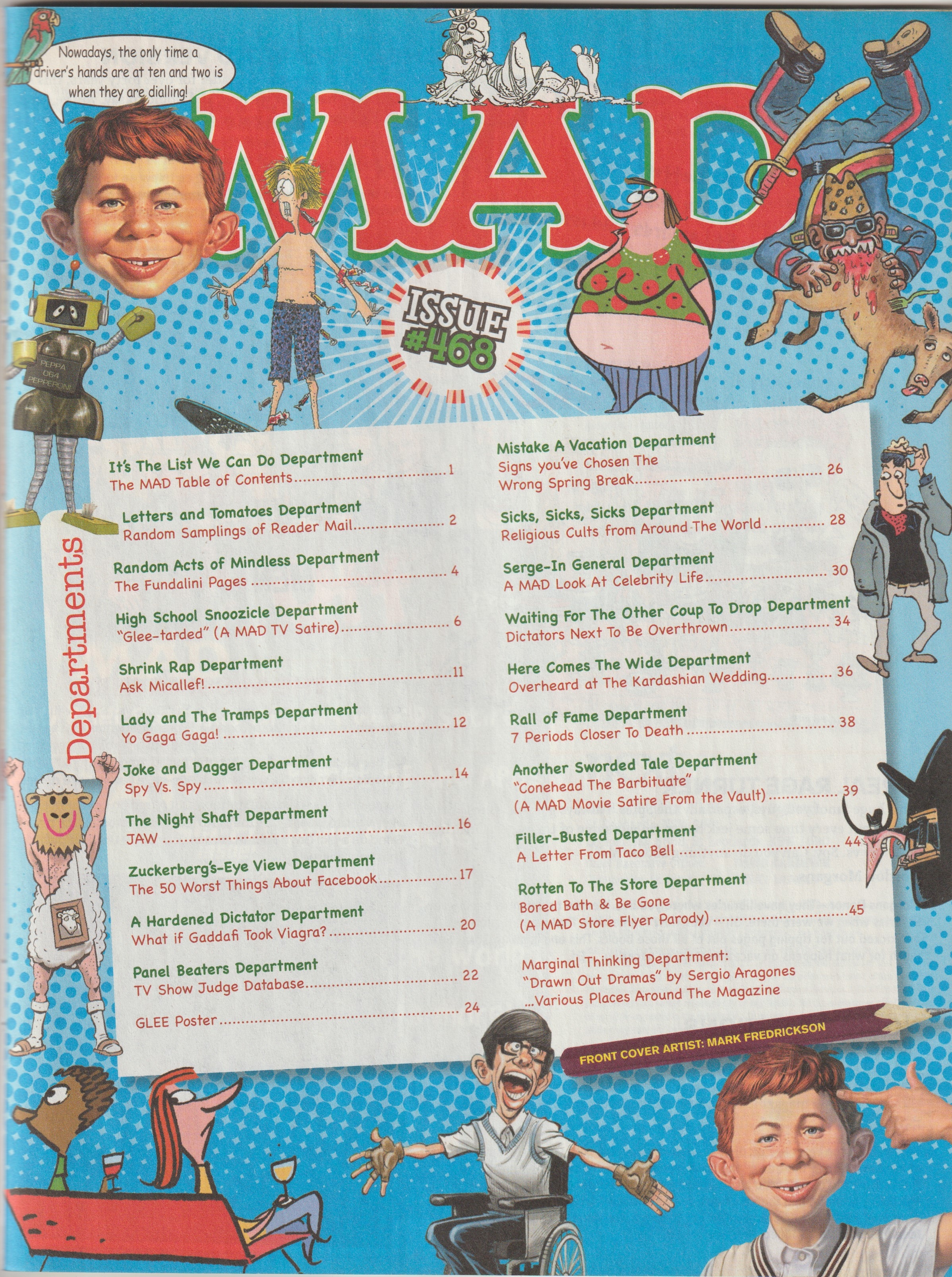 MAD Magazine #468 MAD Magazine (Australia) Updated: 0000 Country: AustraliaCompany: nextmedia Pty LtdPublished: October 1st, 2011Cover: The 50 Worst Things about FacebookOriginal cover: MAD Magazine #509 • USA • 1st Edition - New YorkSale price: AU$5.95Pages: 50 Editorial Editor: Dave WilliamsCover Artist: Mark Fredrickson Additional Images Cover Variations USA
