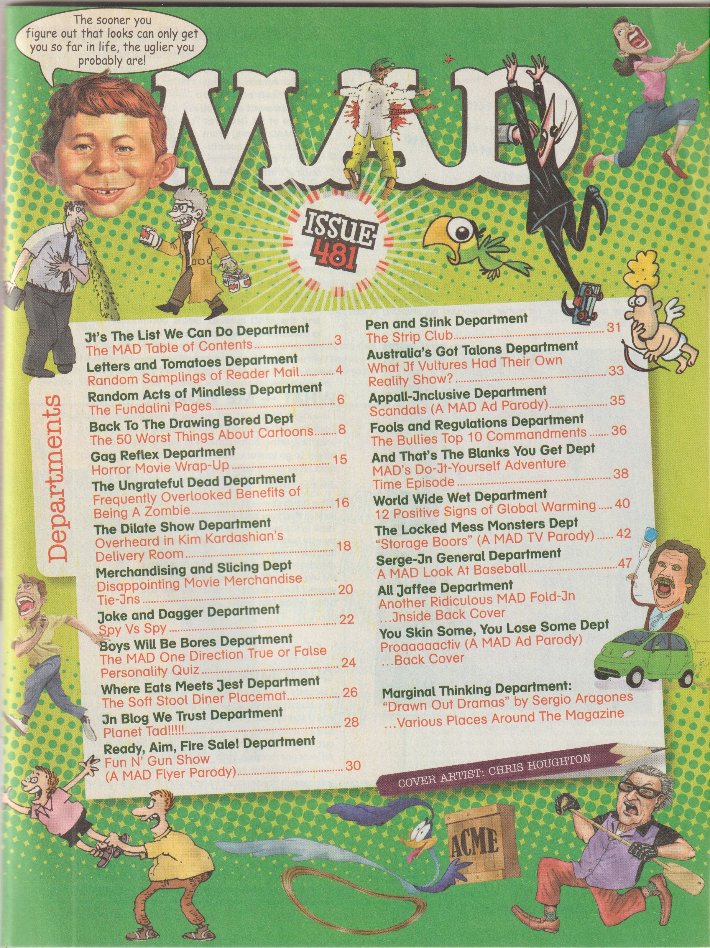 MAD Magazine #481 MAD Magazine (Australia) Updated: December 23rd, 2017 Country: AustraliaCover: 50 Worst Things about CartoonsOriginal cover: MAD Magazine #520 • USA • 1st Edition - New YorkSale price: AU$6.95 Editorial Editor: Dave Williams Additional Images Cover Variations USA