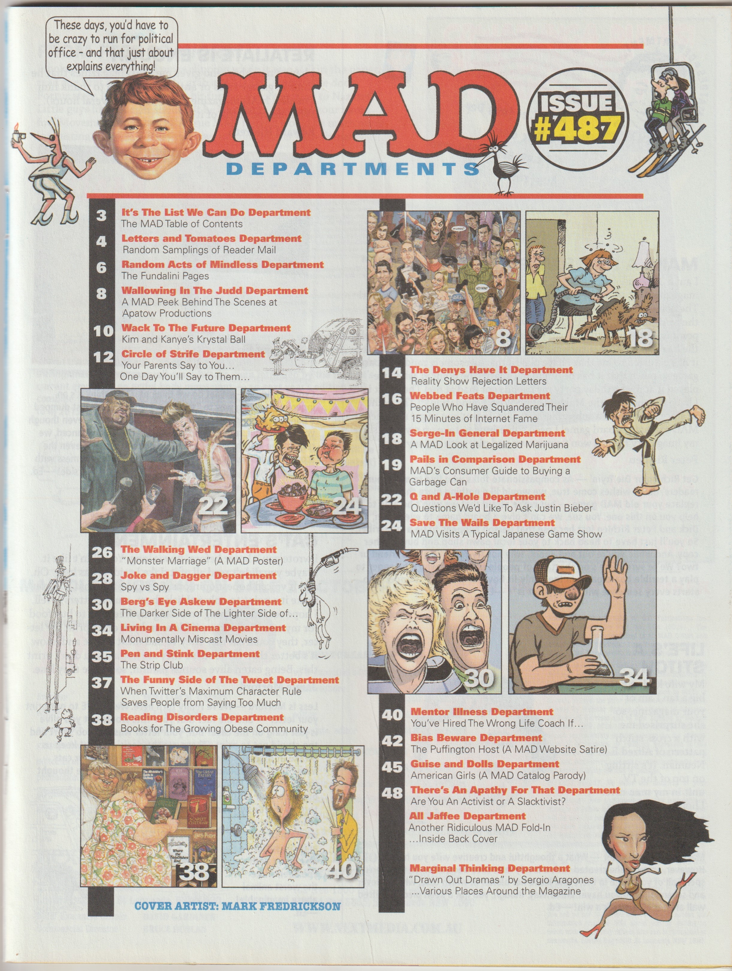 MAD Magazine #487 MAD Magazine (Australia) Updated: 0000 Country: AustraliaCompany: nextmedia Pty LtdCover: Kim & Kanye in... Monster Marriage!Sale price: AU$6.95Pages: 52 Editorial Editor: Dave WilliamsCover Artist: Mark Fredrickson Additional Images