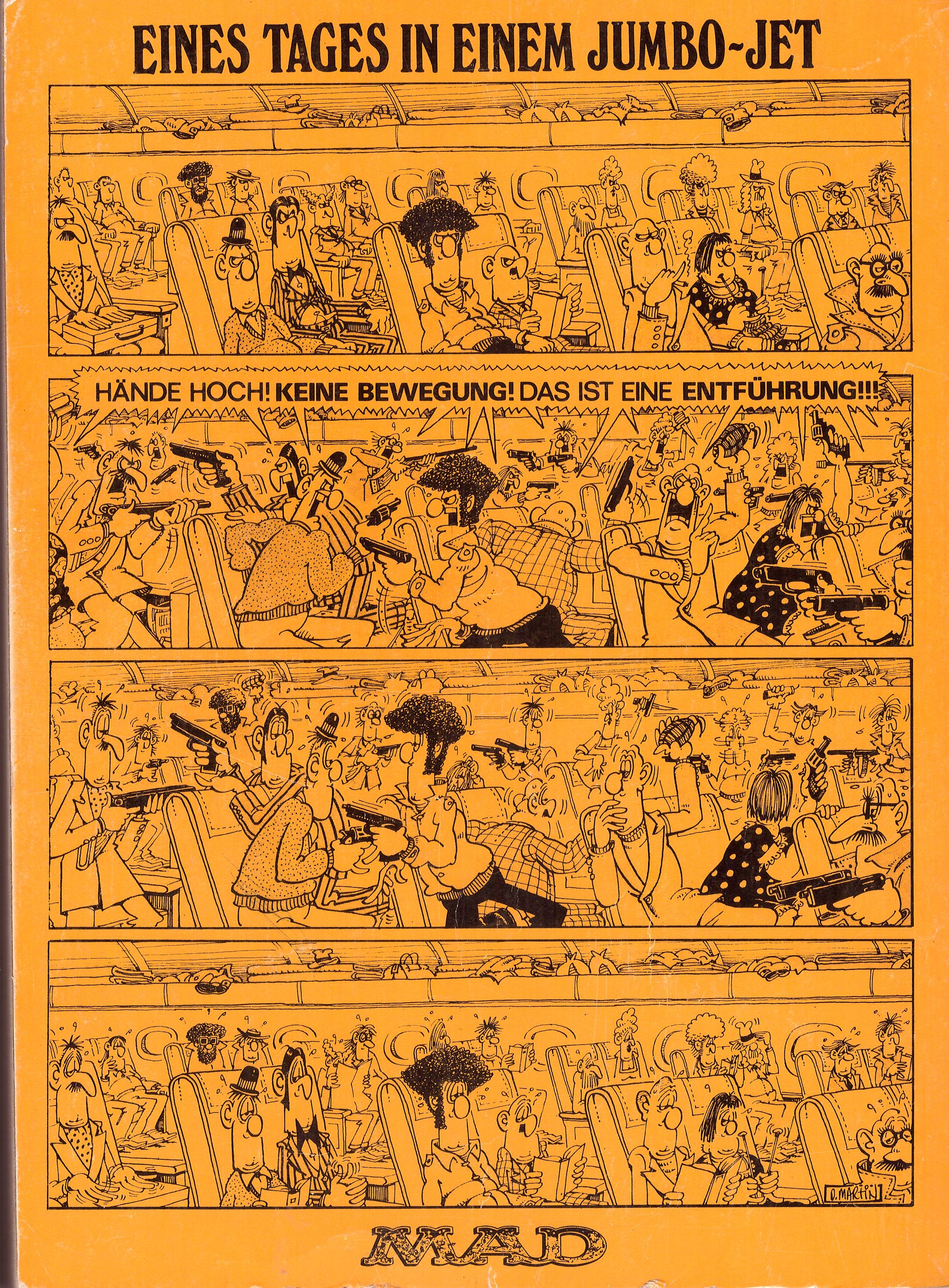 This massive orange-covered paperback is a legendary "Sammelband" (omnibus) published by the iconic German counter-culture distributor Zweitausendeins. The cover boldly proclaims "500 Seiten Nonsens & Satire," promising a gargantuan collection that repackages the content of 14 individual German MAD magazines for the "lousy" price of just 9.90 DM. The front features the classic MAD logo filled with tiny character doodles, alongside a portrait of a grinning Alfred E. Neuman. Alfred sports his trademark features: the iconic gap-tooth, mismatched ears, and that vacant, "nobody's home" stare that has annoyed parents for decades. The second image reveals the internal treasure: a full-page strip by the "MADdest Artist," Don Martin, titled "Eines Tages in einem Jumbo-Jet" (One Day in a Jumbo Jet), featuring his unmistakable bulbous-nosed characters and signature slapstick style.