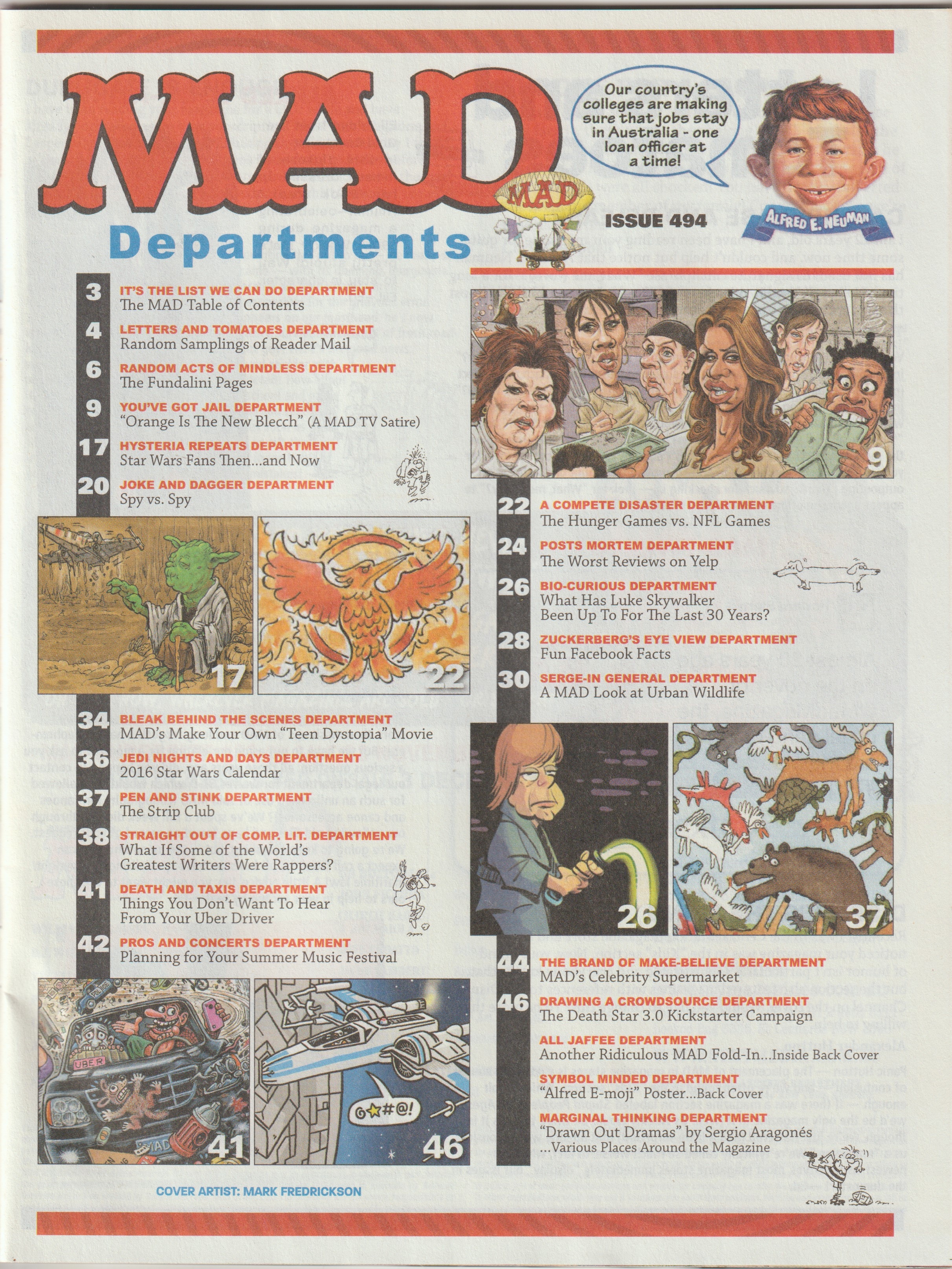 MAD Magazine #494 MAD Magazine (Australia) Updated: November 25th, 2015 Country: AustraliaCompany: nextmedia Pty LtdPublished: December 1st, 2015Cover: A Sneak Peek At The New Star WarsOriginal cover: MAD Magazine #532 • USA • 1st Edition - New YorkSale price: AU$6.95Pages: 52 Editorial Editor: Dave WilliamsCover Artist: Mark FredricksonCirculation Director: Robert G. "Bob" JonesGraphics Consultant: Yvette MatthewsProduction Manager: Peter RymanAdvertising Enquiries: Julie Davidson Additional Images Cover Variations USAGermanySpainBrasil