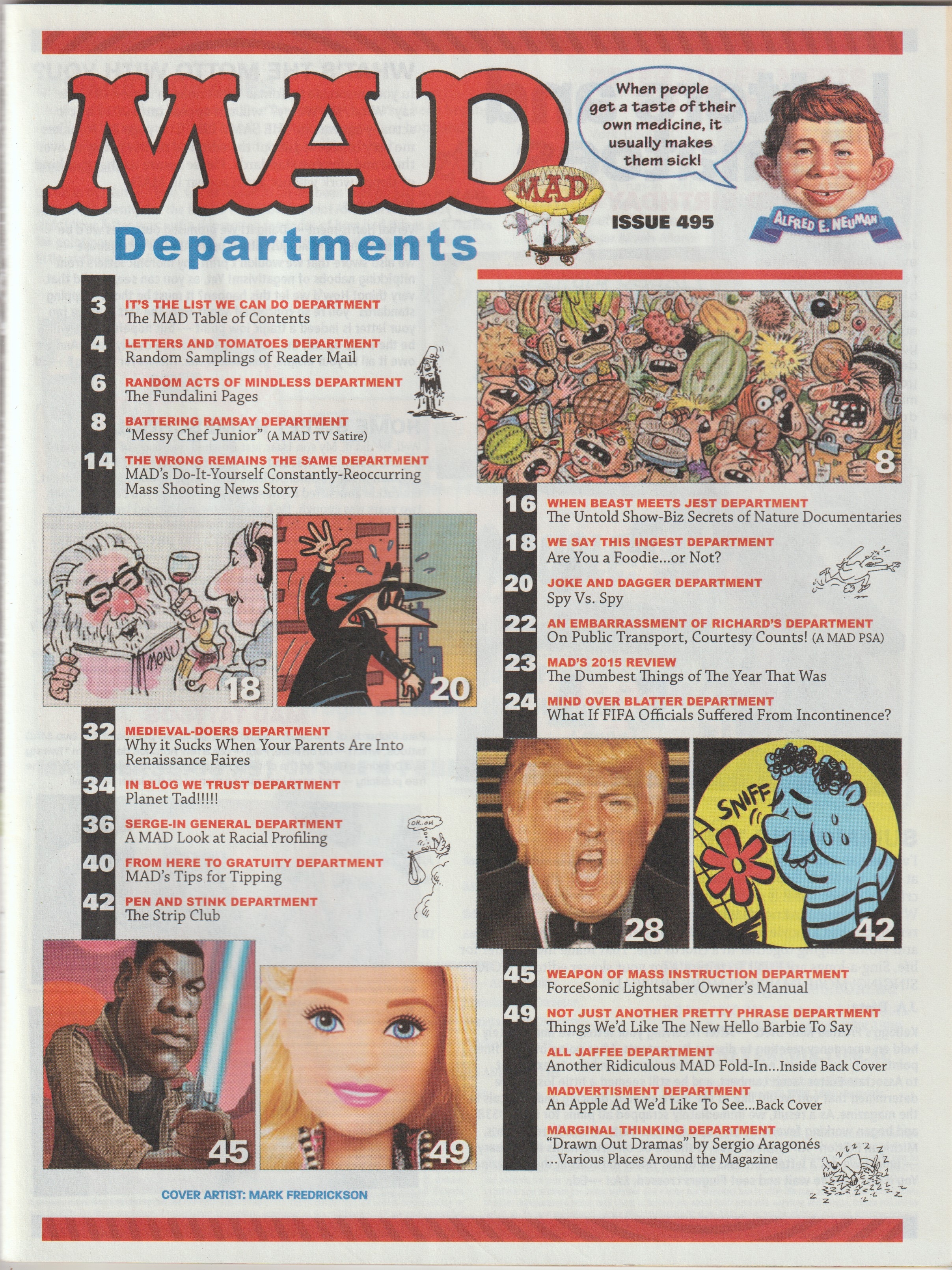 MAD Magazine #495 MAD Magazine (Australia) Updated: January 10th, 2016 Country: AustraliaCompany: nextmedia Pty LtdPublished: February 1st, 2016Cover: Gordon Ramsays MasterChef JuniorOriginal cover: MAD Magazine #536 • USA • 1st Edition - New YorkSale price: AU$6.95Pages: 52 Editorial Editor: Dave WilliamsCover Artist: Mark FredricksonGraphics Consultant: Yvette MatthewsProduction Manager: Peter RymanCirculation Director: Carole JonesAdvertising Enquiries: Julie Davidson Additional Images Cover Variations USA