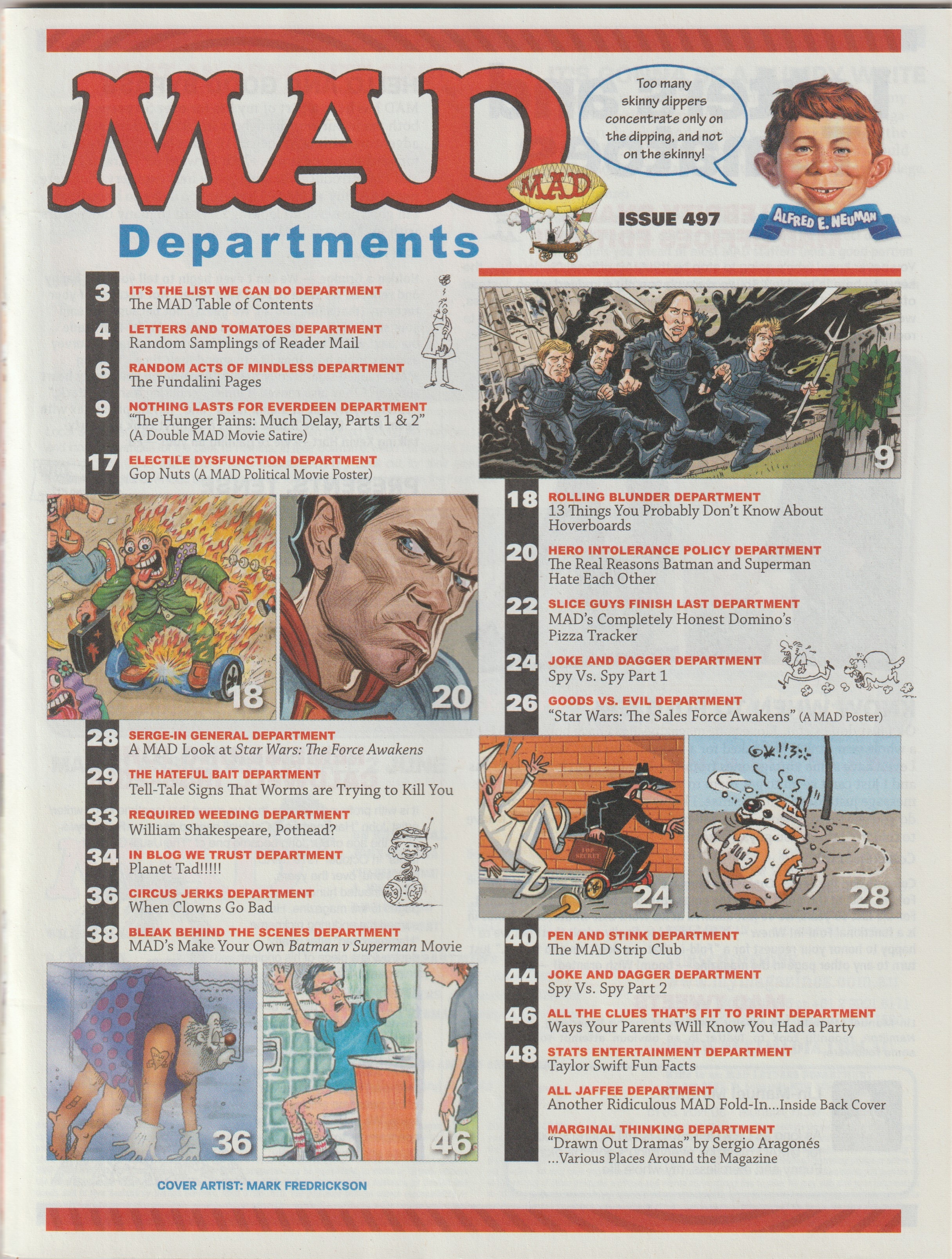 MAD Magazine #497 MAD Magazine (Australia) Updated: May 18th, 2016 Country: AustraliaCompany: nextmedia Pty LtdPublished: June 1st, 2016Cover: Hover Boards! Our Explosive Exposé!Original cover: MAD Magazine #538 • USA • 1st Edition - New YorkSale price: AU$6.95Pages: 52 Editorial Editor: Dave WilliamsCover Artist: Mark FredricksonProduction Manager: Peter RymanCirculation Director: Carole JonesAdvertising Enquiries: Julie DavidsonGraphics Consultant: Jono Bishop Additional Images Cover Variations USA