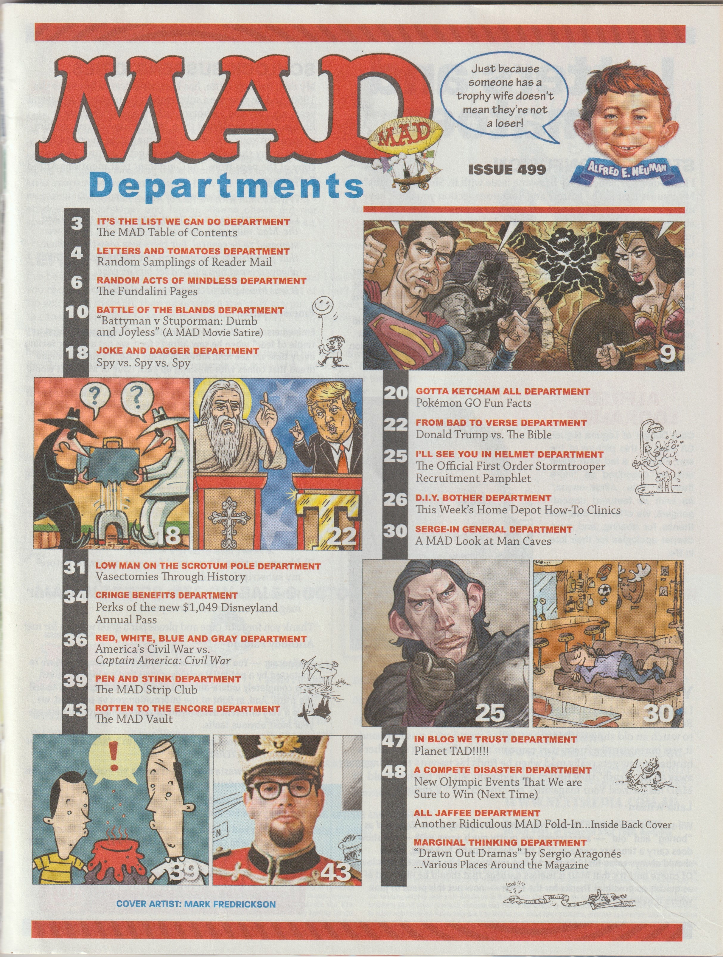 MAD Magazine #499 MAD Magazine (Australia) Updated: September 24th, 2016 Country: AustraliaCompany: nextmedia Pty LtdPublished: October 1st, 2016Cover: Trump CoverOriginal cover: MAD Magazine #540 • USA • 1st Edition - New YorkSale price: AU$6.95Pages: 52 Editorial Editor: Dave WilliamsCover Artist: Mark FredricksonProduction Manager: Peter RymanCirculation Director: Carole JonesAdvertising Enquiries: Julie DavidsonGraphics Consultant: Jono Bishop Additional Images Cover Variations USAMexico