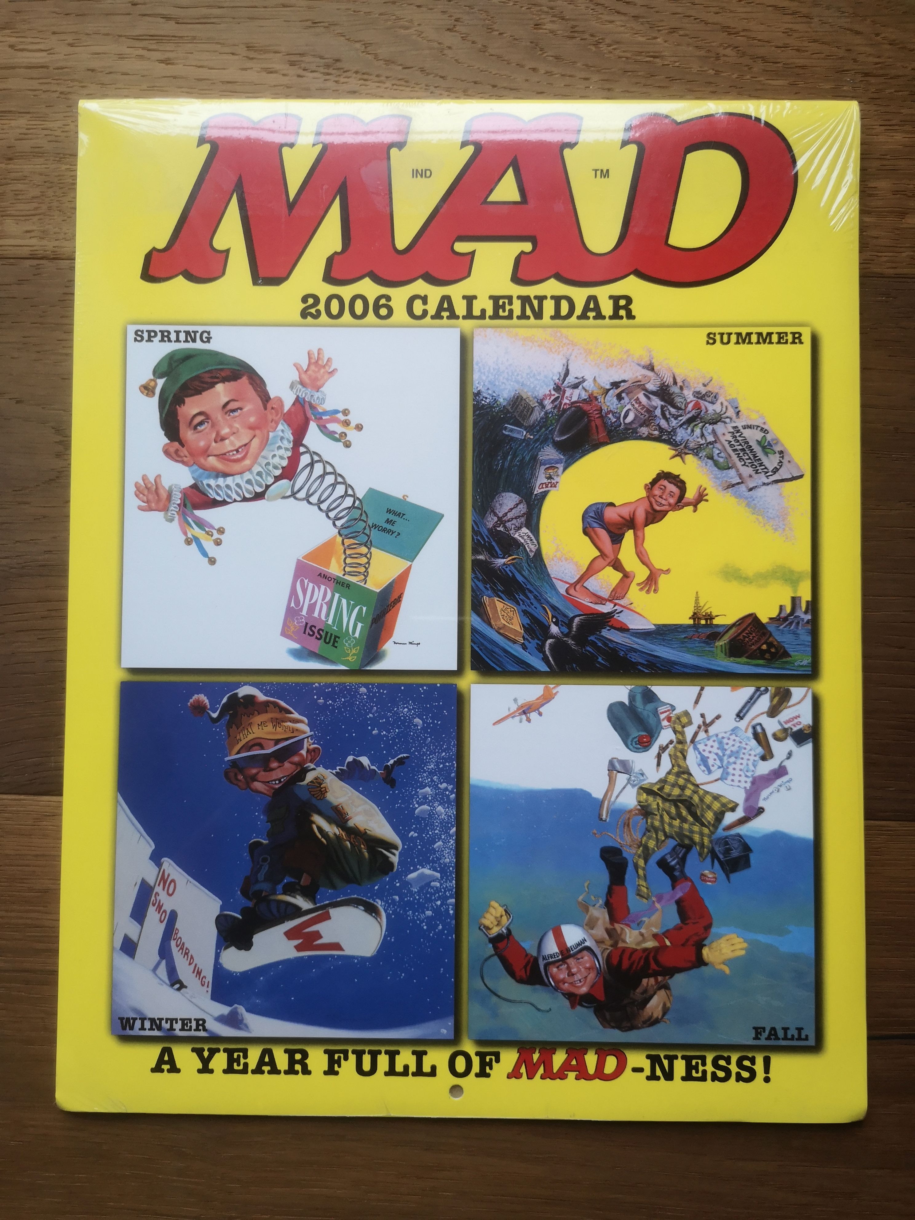 This is a rare piece of MAD Magazine memorabilia. Produced in 2005 by Tide-Mark, this is a MAD Magazine wall calendar. Each page of this calendar features full-color reprints from the pages of MAD, and features artwork from the likes of Sergio Aragones, Dave Berg, Antonio Prohias, John Caldwell, and Al Jaffee. Measuring approx. 10 3/4" by 13 3/4".