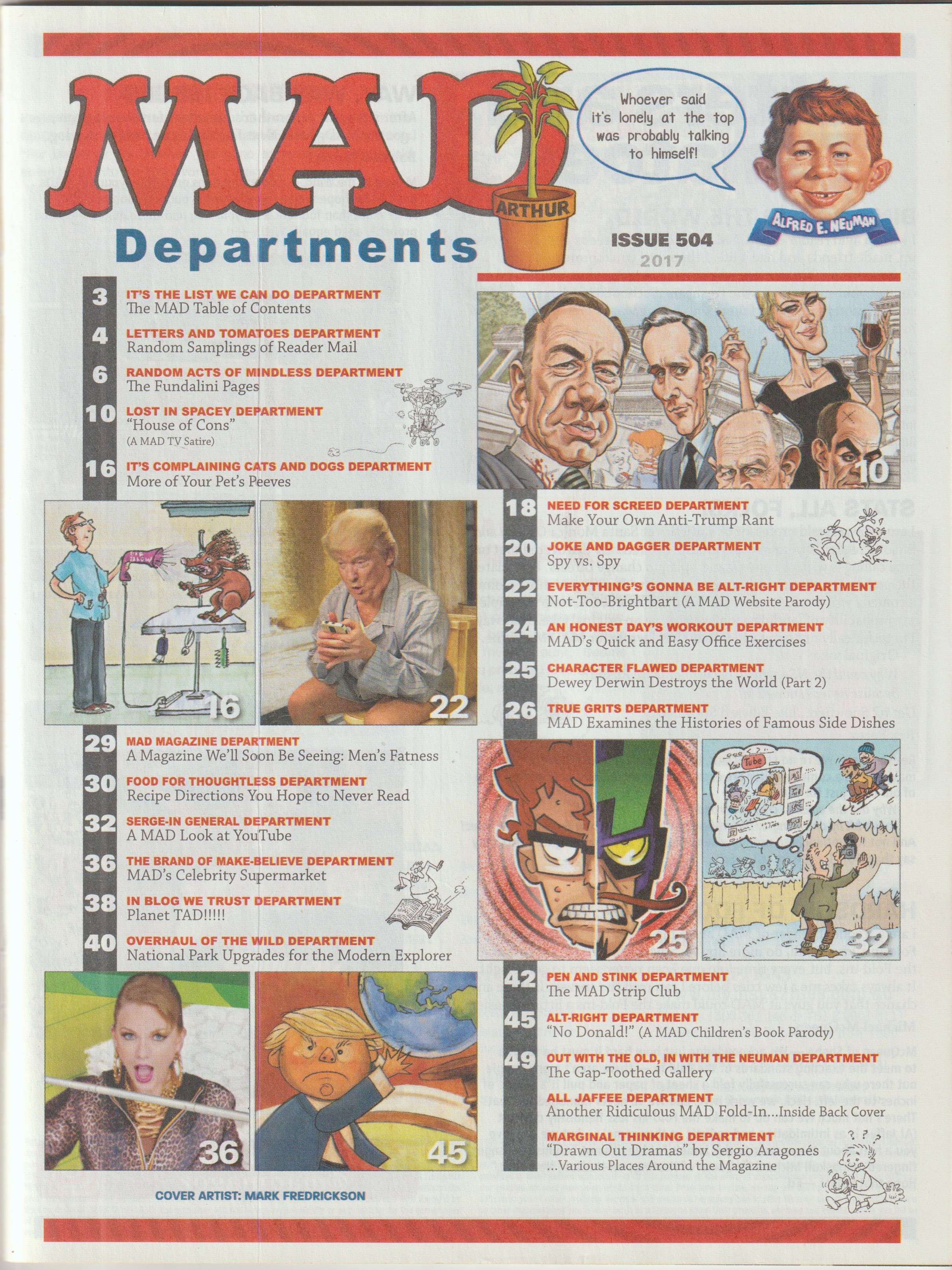 MAD Magazine #504 MAD Magazine (Australia) Updated: July 25th, 2017 Country: AustraliaCompany: nextmedia Pty LtdPublished: August 1st, 2017Cover: Always the Last...With Fake News!Original cover: MAD Magazine #545 • USA • 1st Edition - New YorkSale price: AU$6.95Pages: 52Inserts: - Editorial Designer, Editor: Dave WilliamsCover Artist: Mark FredricksonProduction Manager: Peter RymanCirculation Director: Carole JonesGraphics Consultant: Jono Bishop Additional Images Cover Variations USA
